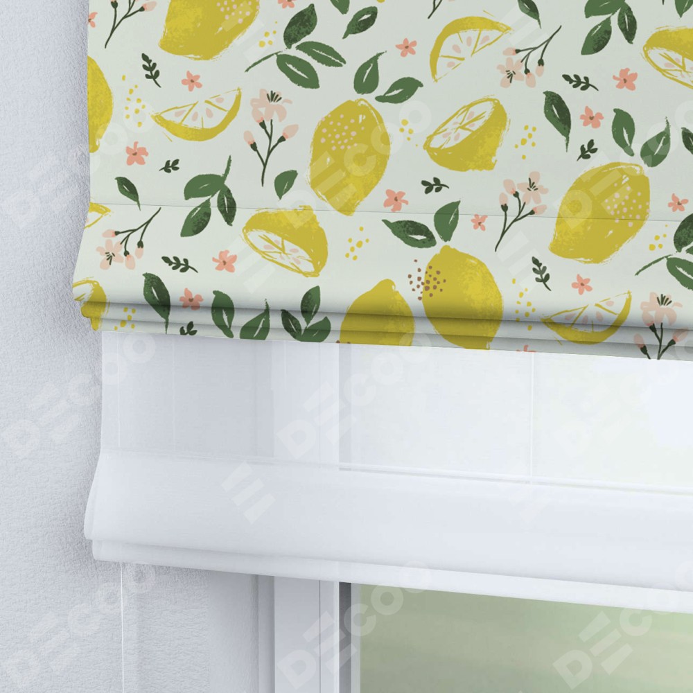 Римская штора день-ночь производителя «Cortin», используется для проёма, пошита из двух полотен, с лицевой блэкаут с нанесением сублимационной печати «Сочные лимоны», вторая ткань тюль (по стандарту комплектуется тюль белого цвета артикул V-01). Имеет универсальный механизм и подходит для монтажа: на потолок, на стену и в нишу.