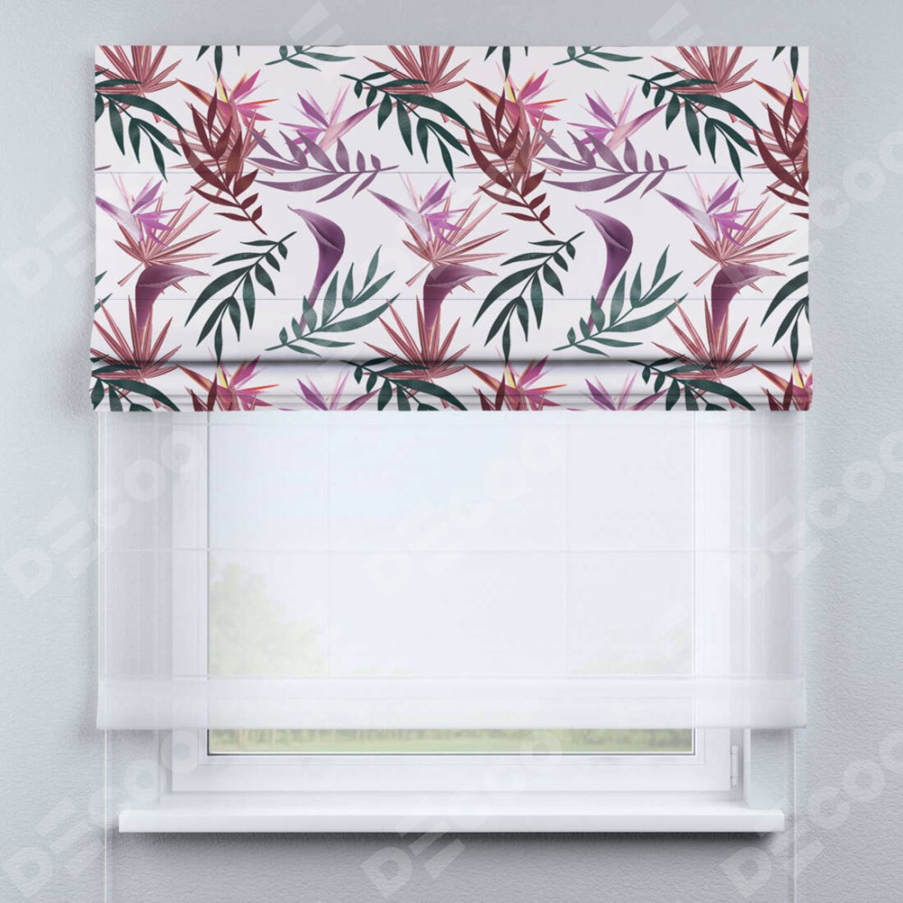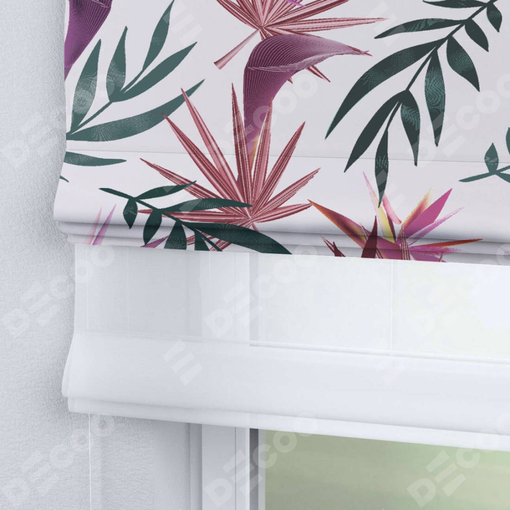 Римская штора день-ночь производителя «Cortin», используется для проёма, пошита из двух полотен, с лицевой блэкаут с нанесением сублимационной печати «Тропические побеги», вторая ткань тюль (по стандарту комплектуется тюль белого цвета артикул V-01). Имеет универсальный механизм и подходит для монтажа: на потолок, на стену и в нишу.