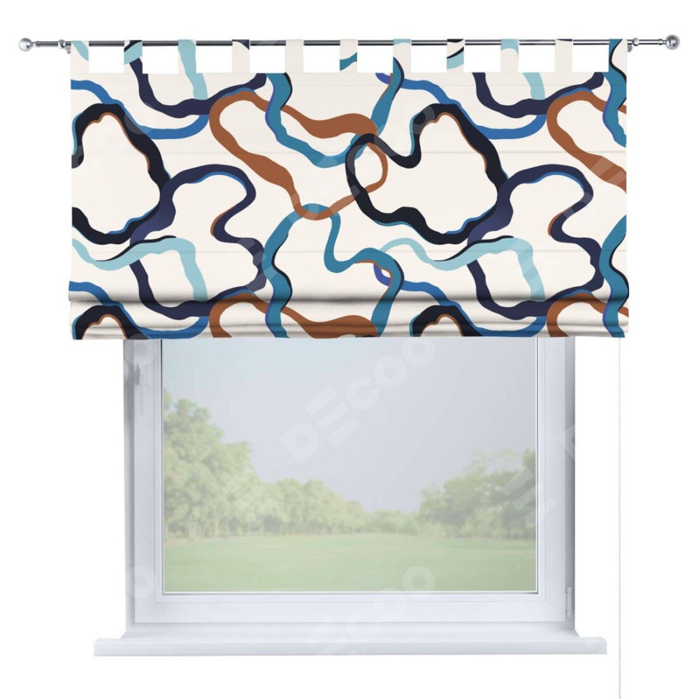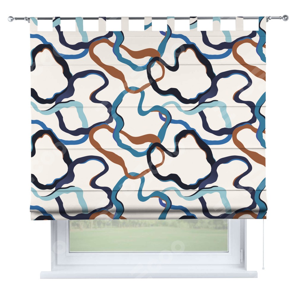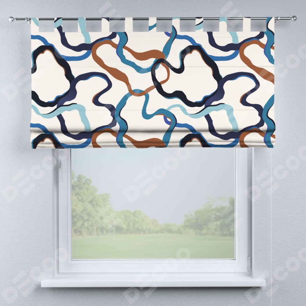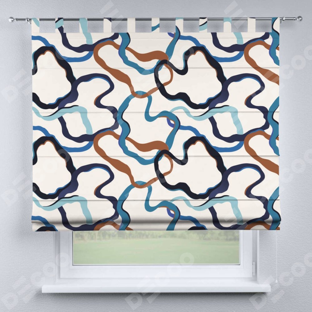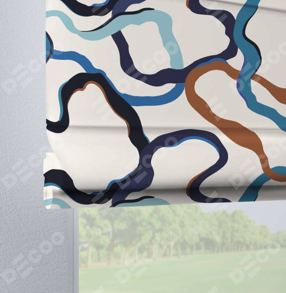Римская штора производителя «Cortin», используется для проёма, пошита из ткани блэкаут с нанесением сублимационной печати «Волнистые ленты». Данная модель пошита на петлях, комплектуется на выбор круглым карнизом и подходит для монтажа на стену. Римская штора на петлях имеет простую систему регулировки высоты, отличительным преимуществом данной модели является простой способ монтажа. Достаточно повесить ее на трубу и штора готова!