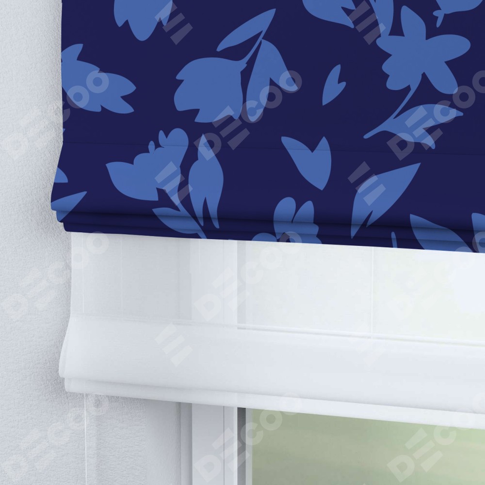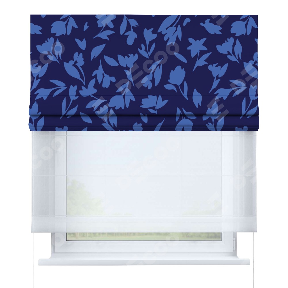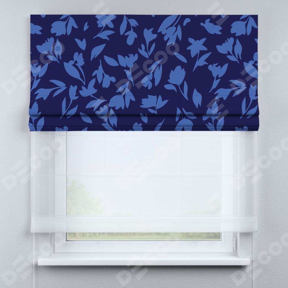 Римская штора день-ночь производителя «Cortin», используется для проёма, пошита из двух полотен, с лицевой блэкаут с нанесением сублимационной печати «Синие цветы», вторая ткань тюль (по стандарту комплектуется тюль белого цвета артикул V-01). Имеет универсальный механизм и подходит для монтажа: на потолок, на стену и в нишу.