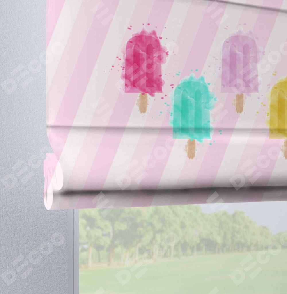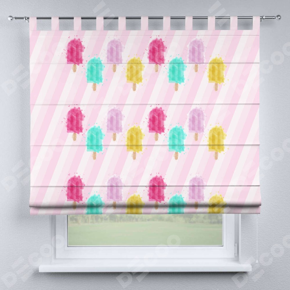 Римская штора производителя «Cortin», используется для проёма, пошита из ткани блэкаут с нанесением сублимационной печати «Фруктовое мороженое». Данная модель пошита на петлях, комплектуется на выбор круглым карнизом и подходит для монтажа на стену. Римская штора на петлях имеет простую систему регулировки высоты, отличительным преимуществом данной модели является простой способ монтажа. Достаточно повесить ее на трубу и штора готова!