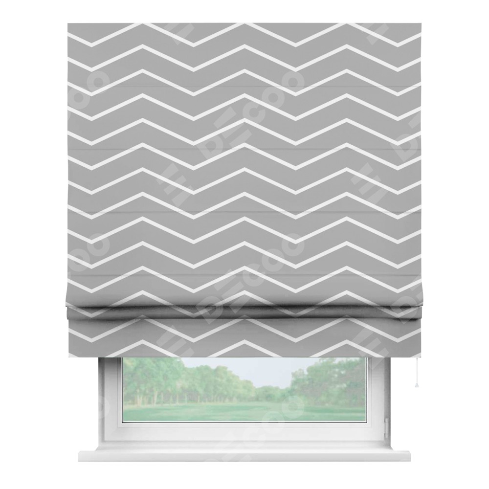 Римская штора производителя «Cortin», используется для проёма, пошита из ткани блэкаут с нанесением сублимационной печати «Серый зигзаг». Имеет универсальный механизм и подходит для монтажа: на потолок, на стену и в нишу.