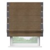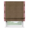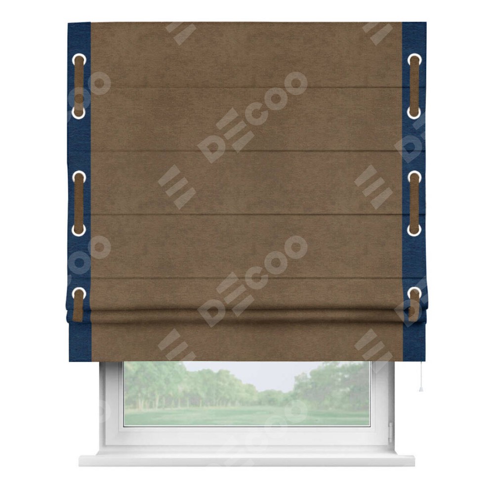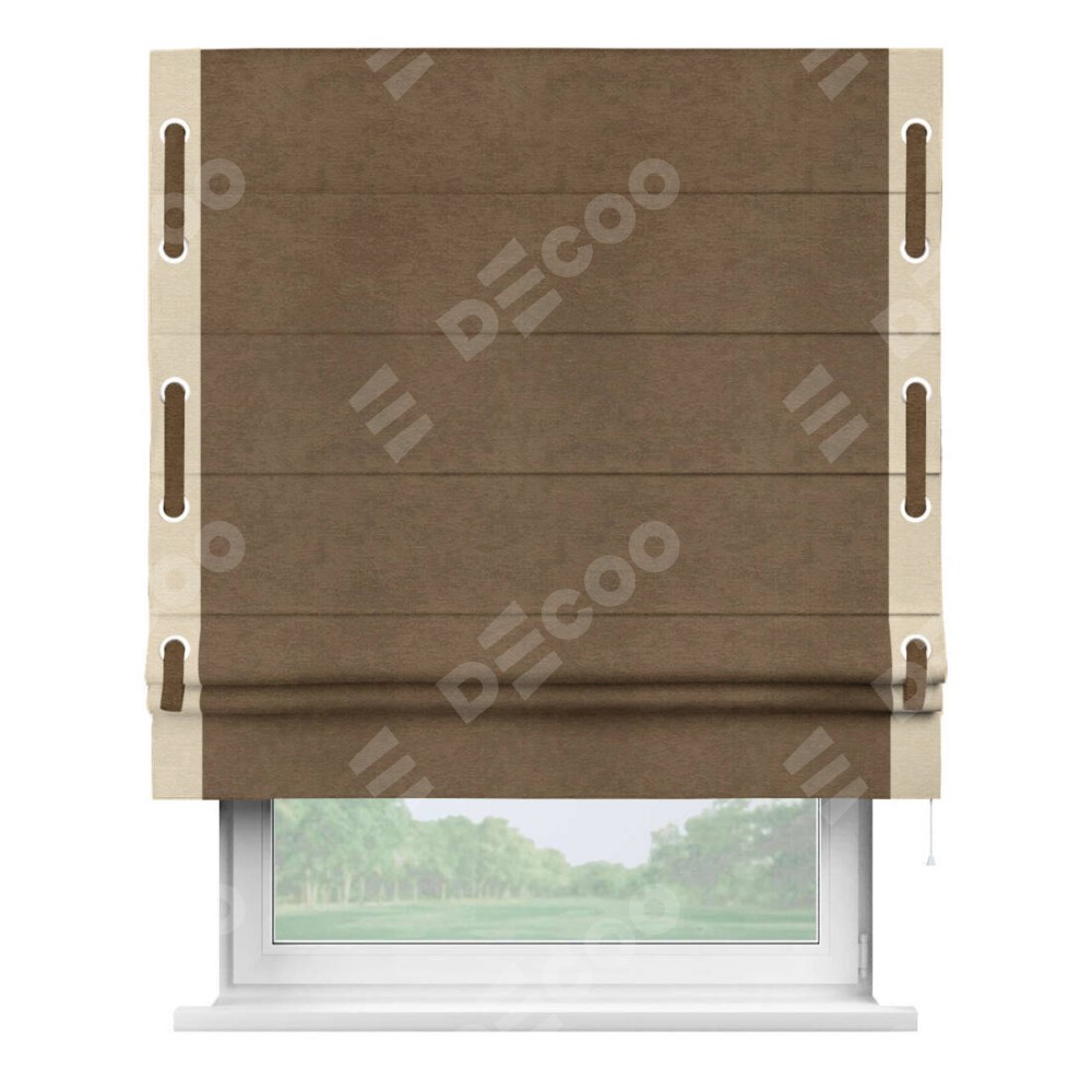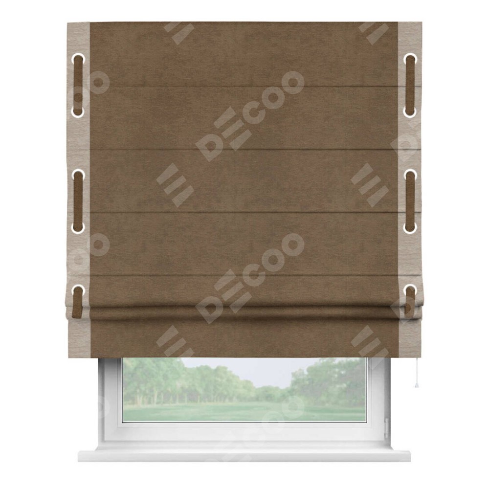 Римская штора производителя «Cortin», используется для проёма, пошита из ткани софт однотонный бронзовый, артикул 33099. Отделка шторы кантом «Стрим Дуо» на кантах расположены люверсы с пояском, ткань для канта используется из софта разной расцветки на выбор. Ткань для пояска обычно используется из основной ткани шторы, а так же можно сделать из любой расцветки по желанию. Имеет универсальный механизм и подходит для монтажа: на потолок, на стену и в нишу.