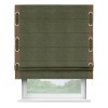 Римская штора производителя «Cortin», используется для проёма, пошита из ткани софт однотонный зелёный, артикул 33110. Отделка шторы кантом «Стрим Дуо» на кантах расположены люверсы с пояском, ткань для канта используется из софта разной расцветки на выбор. Ткань для пояска обычно используется из основной ткани шторы, а так же можно сделать из любой расцветки по желанию. Имеет универсальный механизм и подходит для монтажа: на потолок, на стену и в нишу.