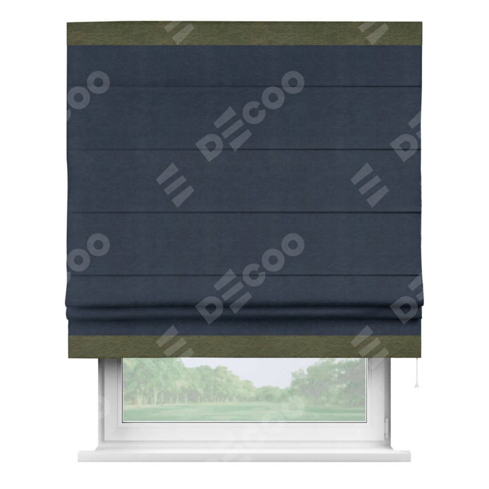Римская штора производителя «Cortin», используется для проёма, пошита из ткани софт однотонный тёмно-синий, артикул 33111. Отделка шторы кантом «Горизонт», ткань для канта используется из софта разной расцветки на выбор. Имеет универсальный механизм и подходит для монтажа: на потолок, на стену и в нишу.