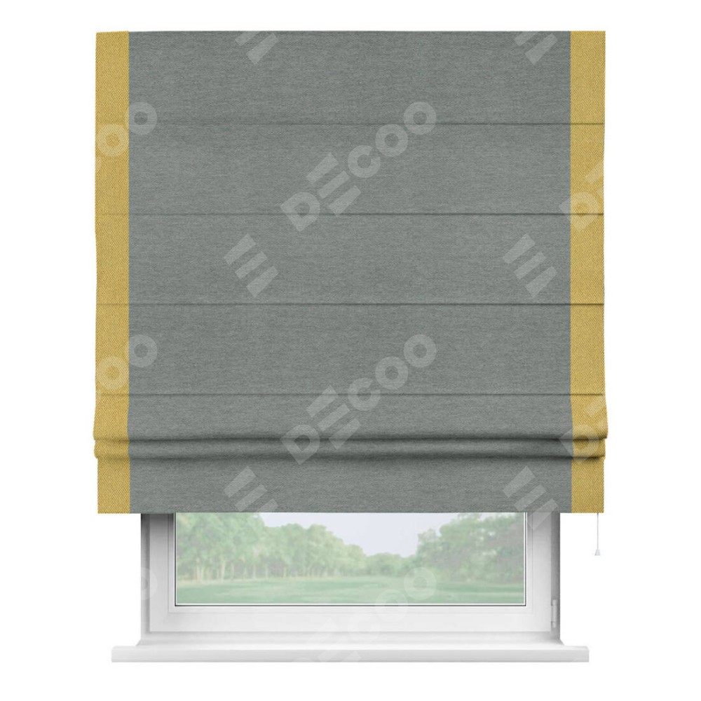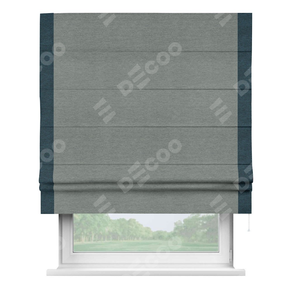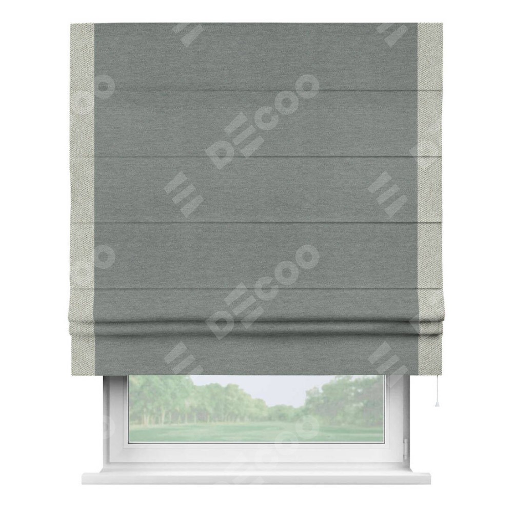 Римская штора производителя «Cortin», используется для проёма, пошита из ткани твид блэкаут серый, артикул 21577. Отделка шторы кантом «Стрим Дуо», ткань для канта используется из твида разной расцветки на выбор. Имеет универсальный механизм и подходит для монтажа: на потолок, на стену и в нишу.