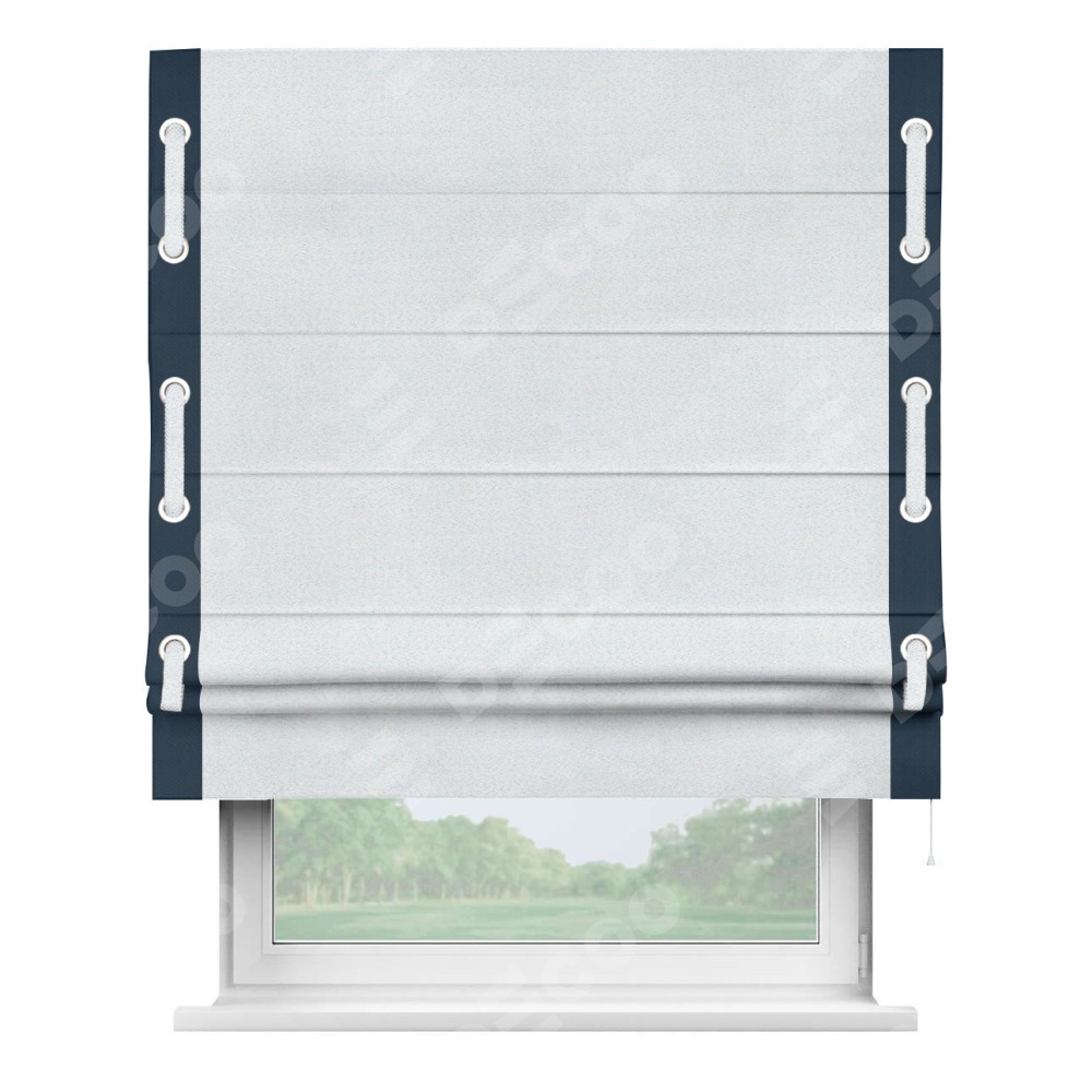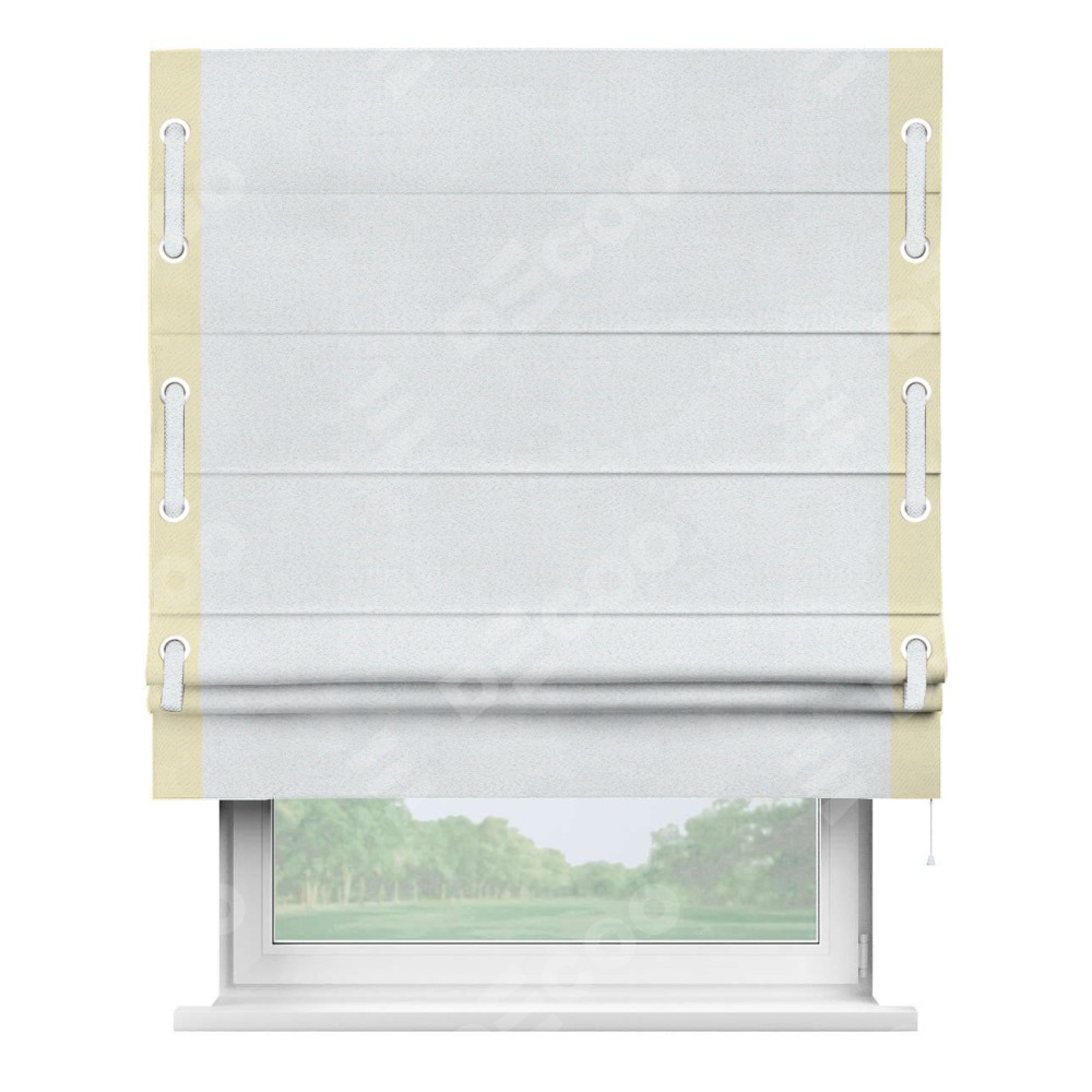 Римская штора производителя «Cortin», используется для проёма, пошита из ткани блэкаут однотонный дымчато-белый, артикул ткани 101. Отделка шторы кантом «Стрим Дуо» на кантах расположены люверсы с пояском, ткань для канта используется из блэкаута однотонного разной расцветки на выбор. Ткань для пояска обычно используется из основной ткани шторы, а так же можно сделать из любой расцветки по желанию. Имеет универсальный механизм и подходит для монтажа: на потолок, на стену и в нишу.