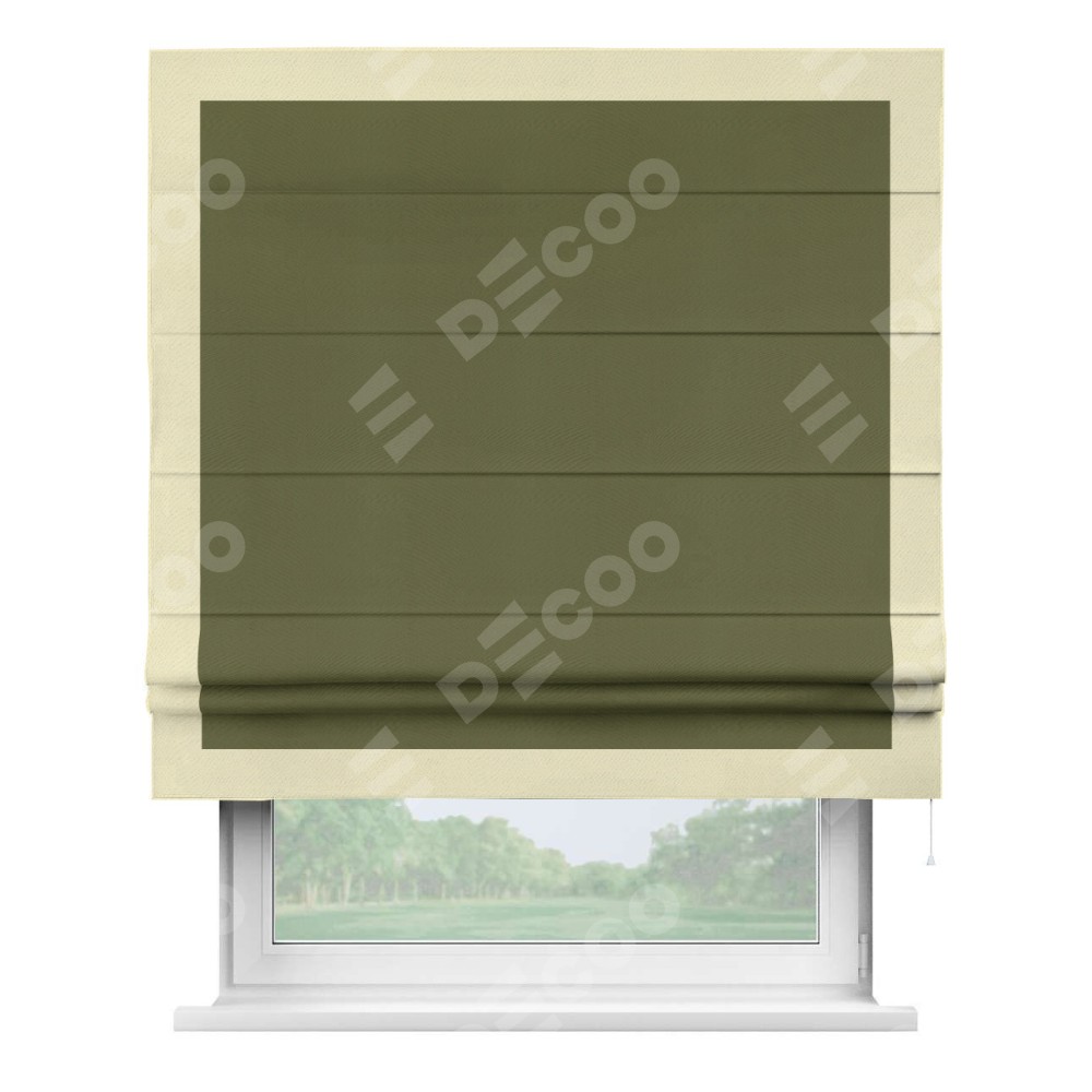 Римская штора производителя «Cortin», используется для проёма, пошита из ткани блэкаут однотонный зелёный, артикул ткани 81859. Отделка шторы кантом «Чесс», ткань для канта используется из блэкаута однотонного разной расцветки на выбор. Имеет универсальный механизм и подходит для монтажа: на потолок, на стену и в нишу.