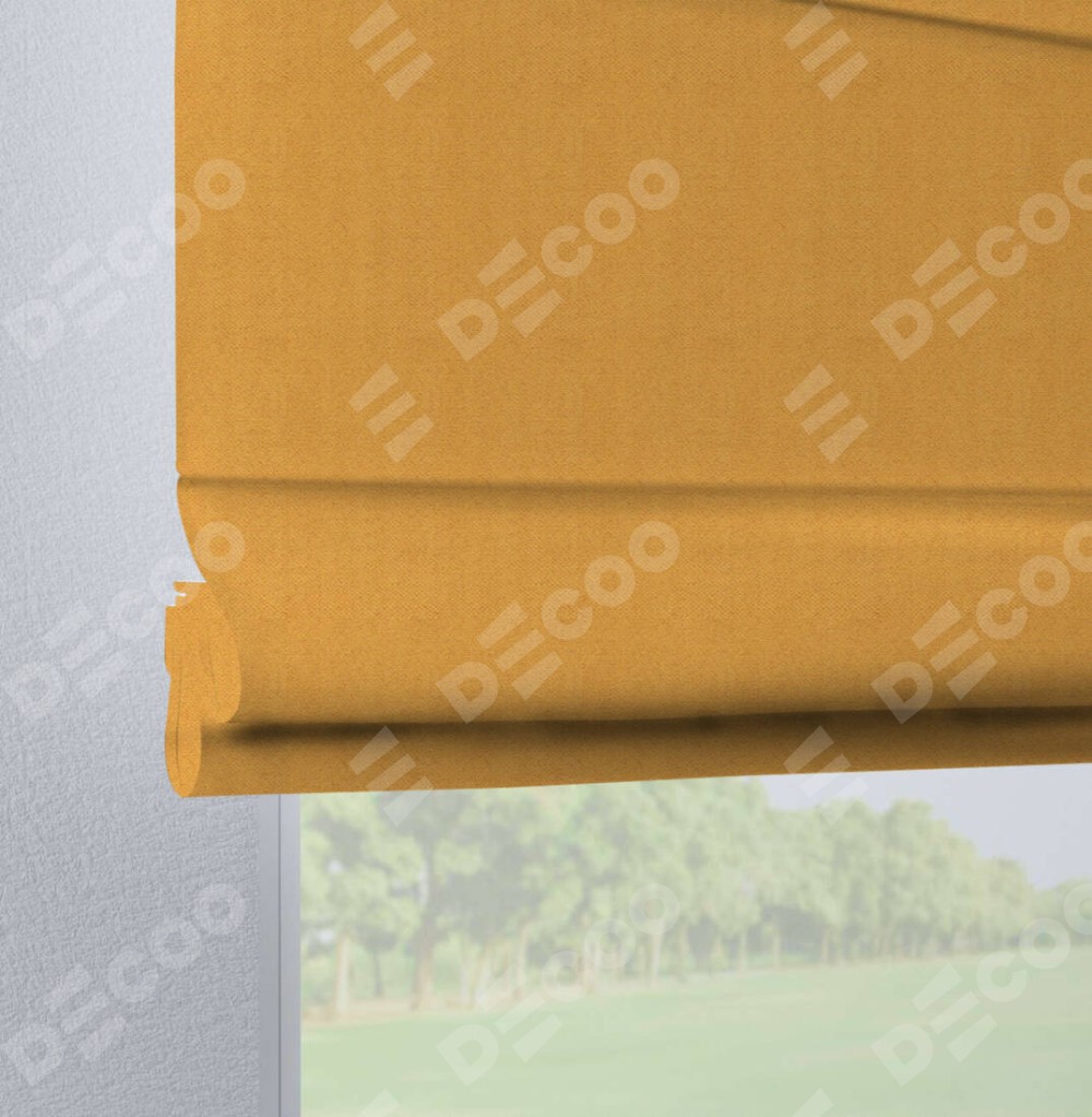Римская штора производителя «Cortin», используется для проёма, пошита из ткани блэкаут тиснение с блеском золотой, артикул ткани 34626. Изнаночная сторона материала черного цвета, что обеспечивает необходимую светонепроницаемость. Данная модель пошита на петлях, комплектуется на выбор круглым карнизом и подходит для монтажа на стену. Римская штора на петлях имеет простую систему регулировки высоты, отличительным преимуществом данной модели является простой способ монтажа. Достаточно повесить ее на трубу и штора готова!