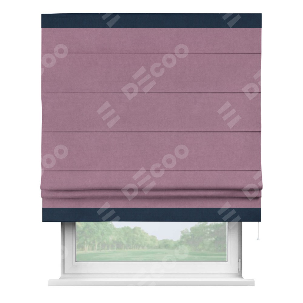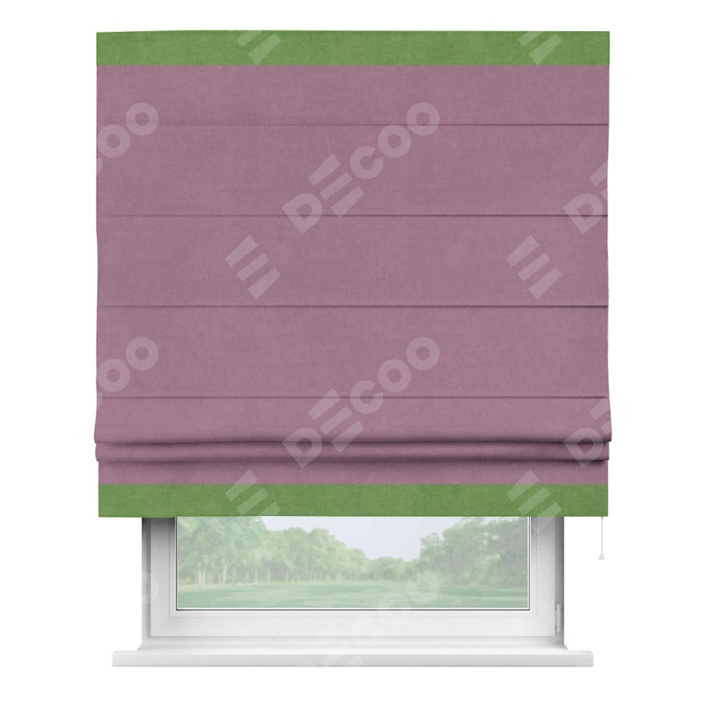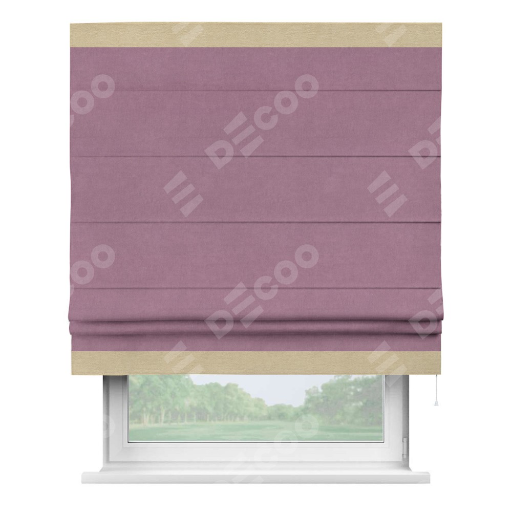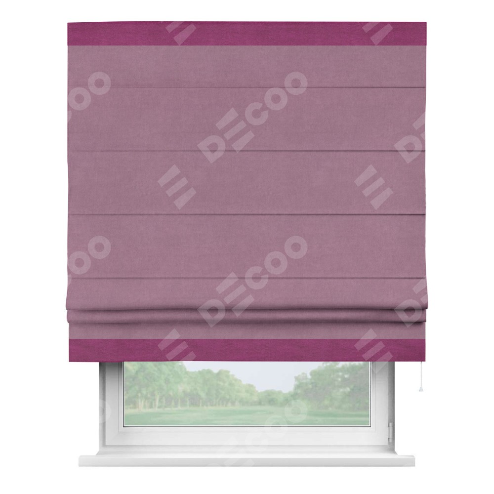 Римская штора производителя «Cortin», используется для проёма, пошита из ткани вельвет лиловый, артикул ткани 17752. Отделка шторы кантом «Горизонт», ткань для канта используется из вельвета разной расцветки на выбор. Имеет универсальный механизм и подходит для монтажа: на потолок, на стену и в нишу.