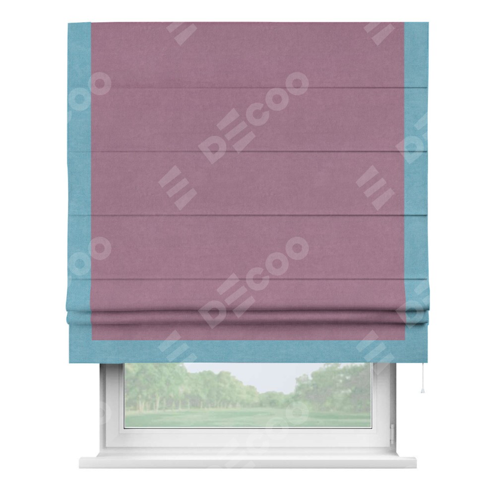 Римская штора производителя «Cortin», используется для проёма, пошита из ткани вельвет лиловый, артикул ткани 17752. Отделка шторы кантом «Виктория», ткань для канта используется из вельвета разной расцветки на выбор. Имеет универсальный механизм и подходит для монтажа: на потолок, на стену и в нишу.