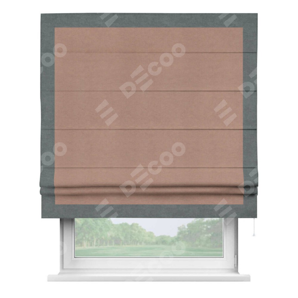 Римская штора производителя «Cortin», используется для проёма, пошита из ткани вельвет брусничный джем, артикул ткани 17750. Отделка шторы кантом «Чесс», ткань для канта используется из вельвета разной расцветки на выбор. Имеет универсальный механизм и подходит для монтажа: на потолок, на стену и в нишу.
