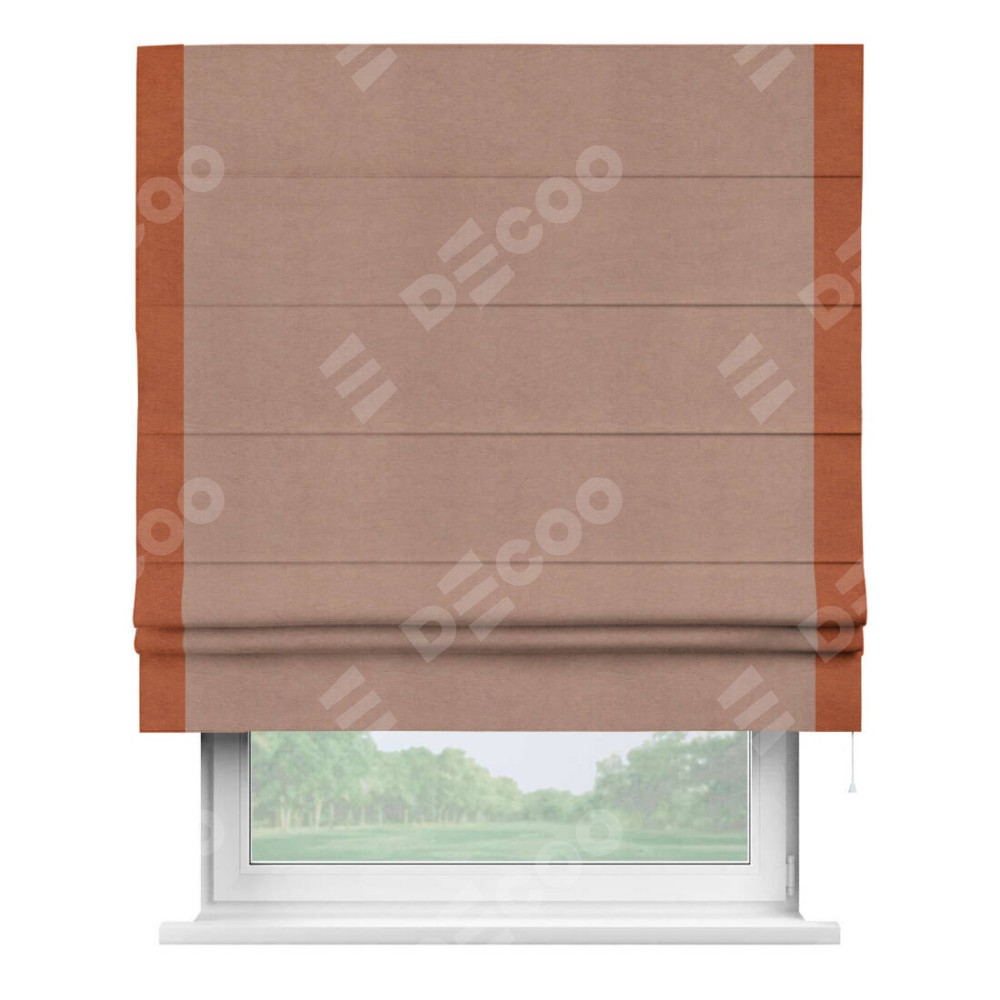 Римская штора производителя «Cortin», используется для проёма, пошита из ткани вельвет брусничный джем, артикул ткани 17750. Отделка шторы кантом «Стрим Дуо», ткань для канта используется из вельвета разной расцветки на выбор. Имеет универсальный механизм и подходит для монтажа: на потолок, на стену и в нишу.