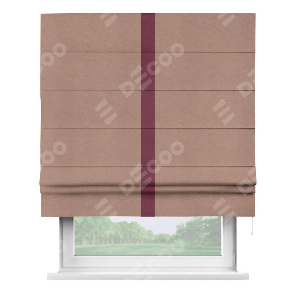 Римская штора производителя «Cortin», используется для проёма, пошита из ткани вельвет брусничный джем, артикул ткани 17750. Отделка шторы кантом «Хайвей», ткань для канта используется из вельвета разной расцветки на выбор. Имеет универсальный механизм и подходит для монтажа: на потолок, на стену и в нишу.