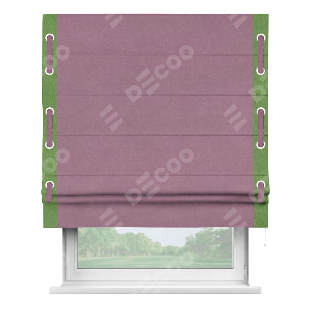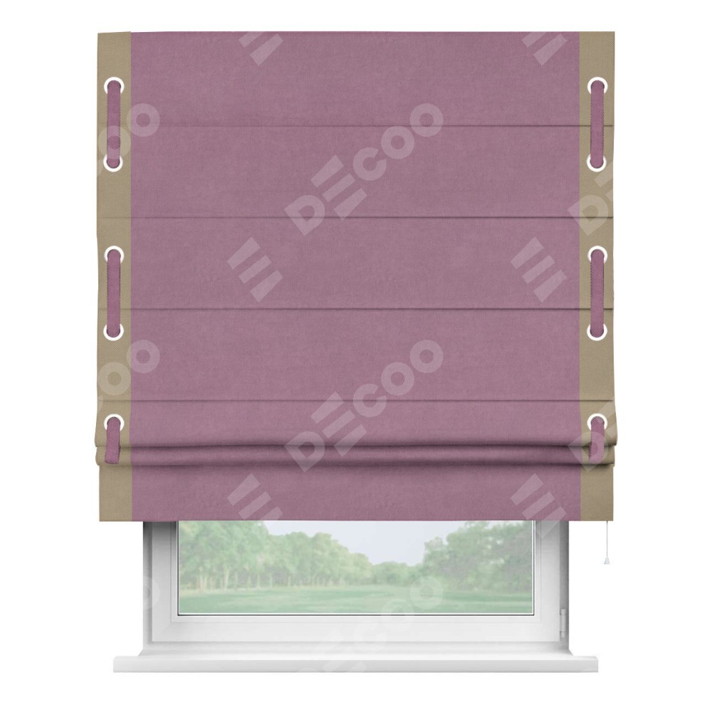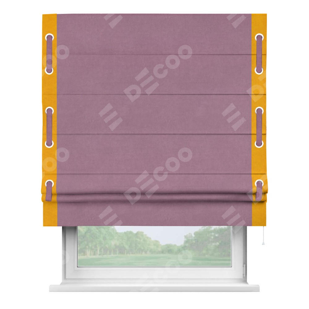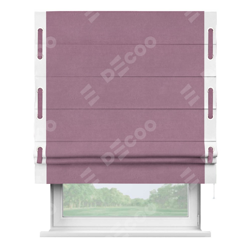 Римская штора производителя «Cortin», используется для проёма, пошита из ткани вельвет лиловый, артикул ткани 17752. Отделка шторы кантом «Стрим Дуо» на кантах расположены люверсы с пояском, ткань для канта используется из вельвета разной расцветки на выбор. Ткань для пояска обычно используется из основной ткани шторы, а так же можно сделать из любой расцветки по желанию. Имеет универсальный механизм и подходит для монтажа: на потолок, на стену и в нишу.