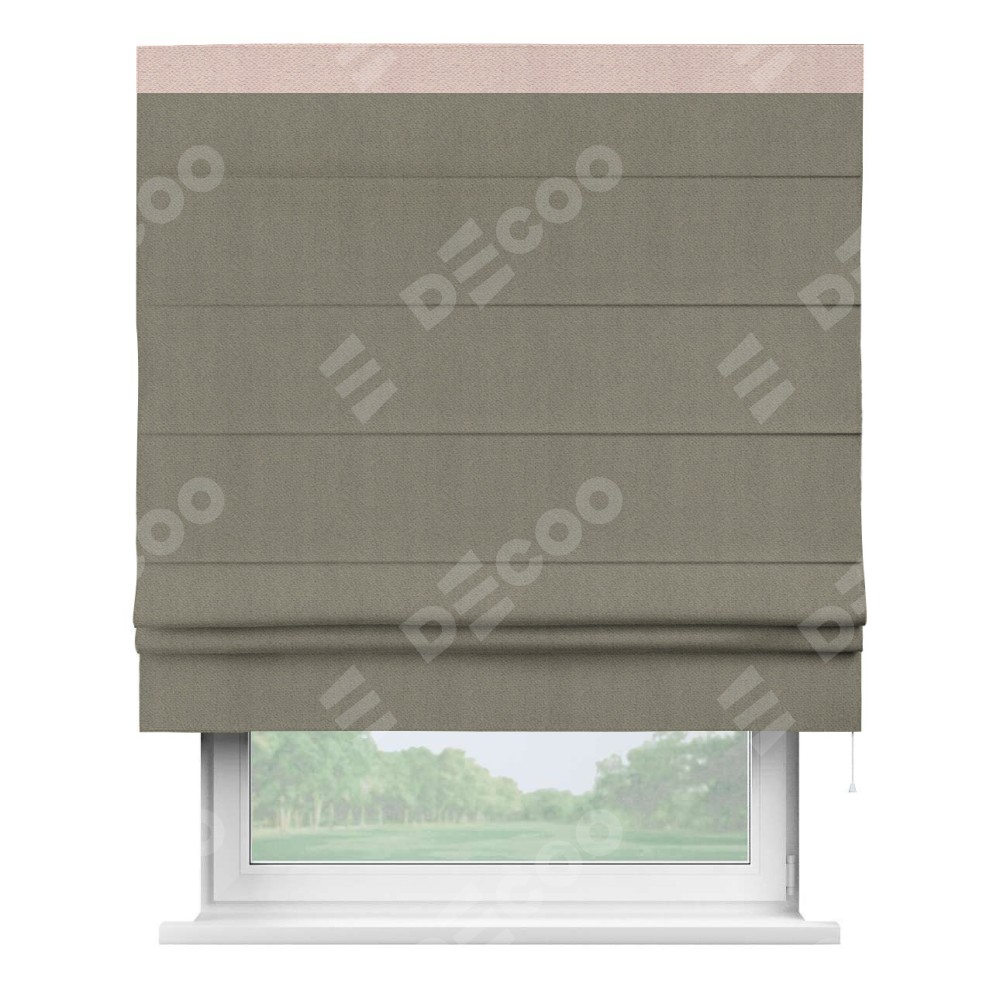 Римская штора производителя «Cortin», используется для проёма, пошита из ткани блэкаут с блеском графитовый, артикул 34648. Отделка шторы кантом «Кинг», ткань для канта используется из блэкаута с блеском разной расцветки на выбор. Изнаночная сторона материала черного цвета, что обеспечивает необходимую светонепроницаемость. Имеет универсальный механизм и подходит для монтажа: на потолок, на стену и в нишу.