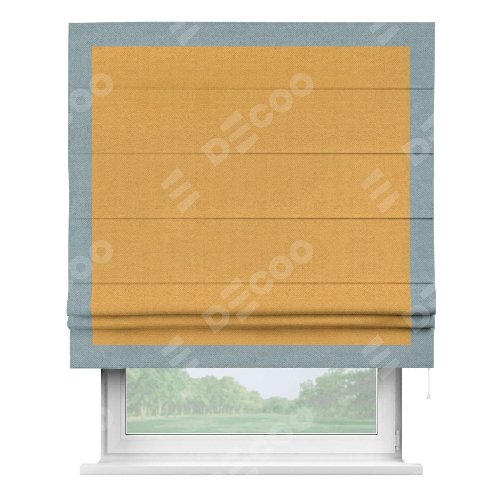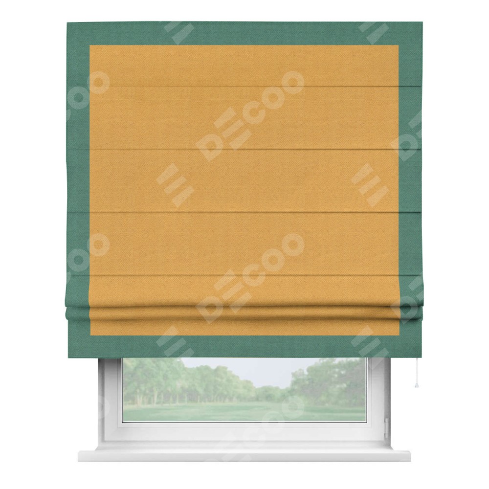 Римская штора производителя «Cortin», используется для проёма, пошита из ткани блэкаут с блеском золотой, артикул 34626. Отделка шторы кантом «Чесс», ткань для канта используется из блэкаута с блеском разной расцветки на выбор. Изнаночная сторона материала черного цвета, что обеспечивает необходимую светонепроницаемость. Имеет универсальный механизм и подходит для монтажа: на потолок, на стену и в нишу.