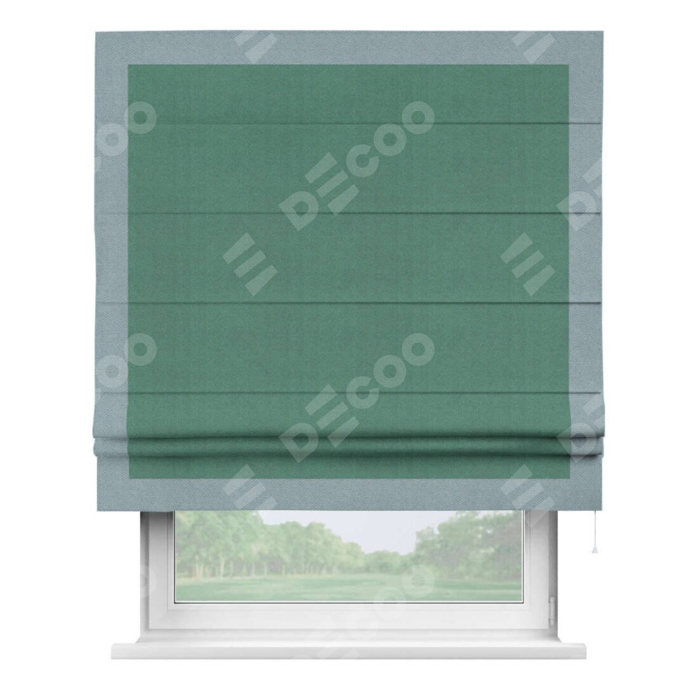 Римская штора производителя «Cortin», используется для проёма, пошита из ткани блэкаут с блеском изумрудный, артикул 34628. Отделка шторы кантом «Чесс», ткань для канта используется из блэкаута с блеском разной расцветки на выбор. Изнаночная сторона материала черного цвета, что обеспечивает необходимую светонепроницаемость. Имеет универсальный механизм и подходит для монтажа: на потолок, на стену и в нишу.