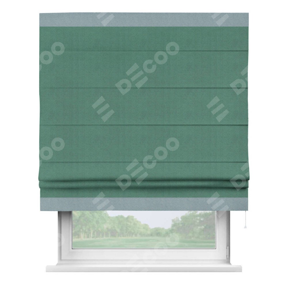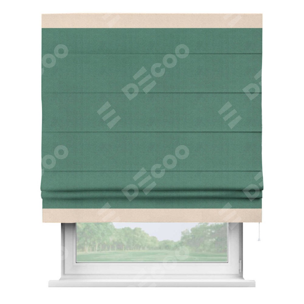 Римская штора производителя «Cortin», используется для проёма, пошита из ткани блэкаут с блеском изумрудный, артикул 34628. Отделка шторы кантом «Горизонт», ткань для канта используется из блэкаута с блеском разной расцветки на выбор. Изнаночная сторона материала черного цвета, что обеспечивает необходимую светонепроницаемость. Имеет универсальный механизм и подходит для монтажа: на потолок, на стену и в нишу.