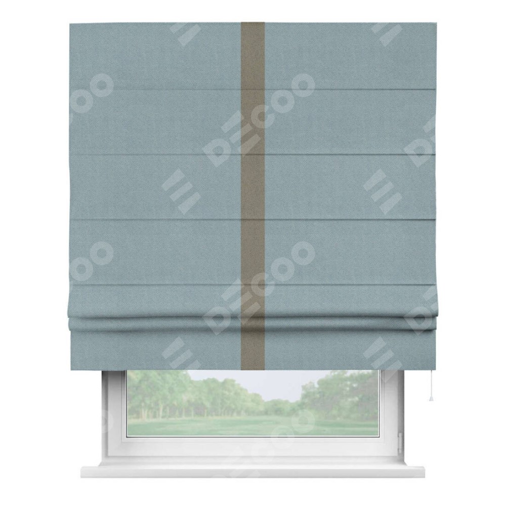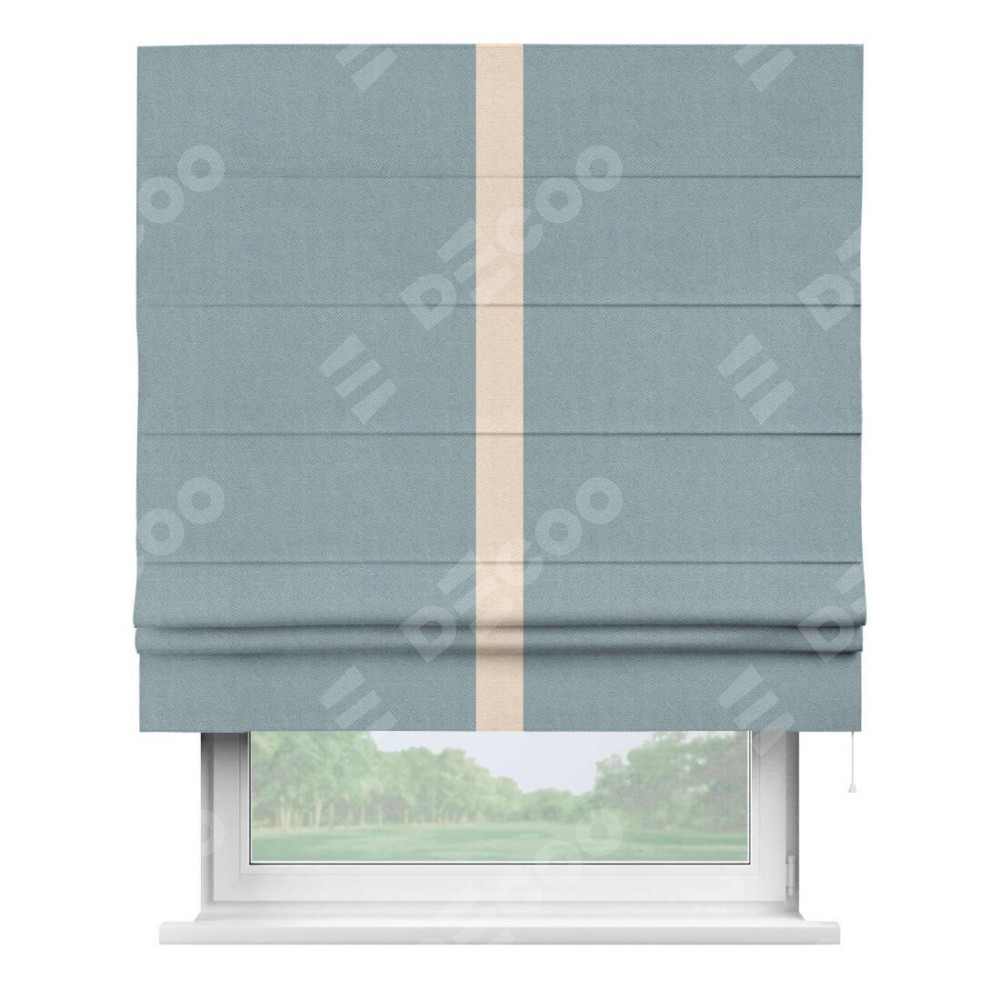 Римская штора производителя «Cortin», используется для проёма, пошита из ткани блэкаут с блеском синий, артикул 34625. Отделка шторы кантом «Хайвэй», ткань для канта используется из блэкаута с блеском разной расцветки на выбор. Изнаночная сторона материала черного цвета, что обеспечивает необходимую светонепроницаемость. Имеет универсальный механизм и подходит для монтажа: на потолок, на стену и в нишу.