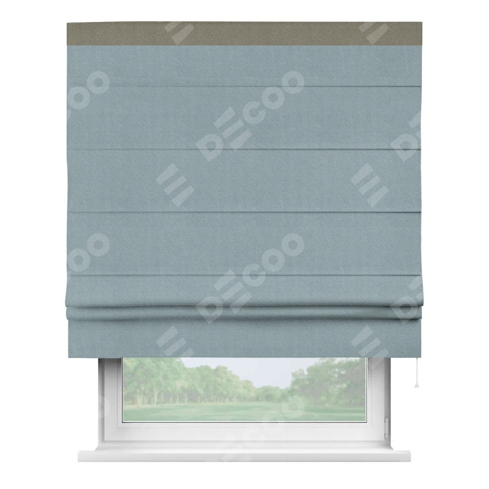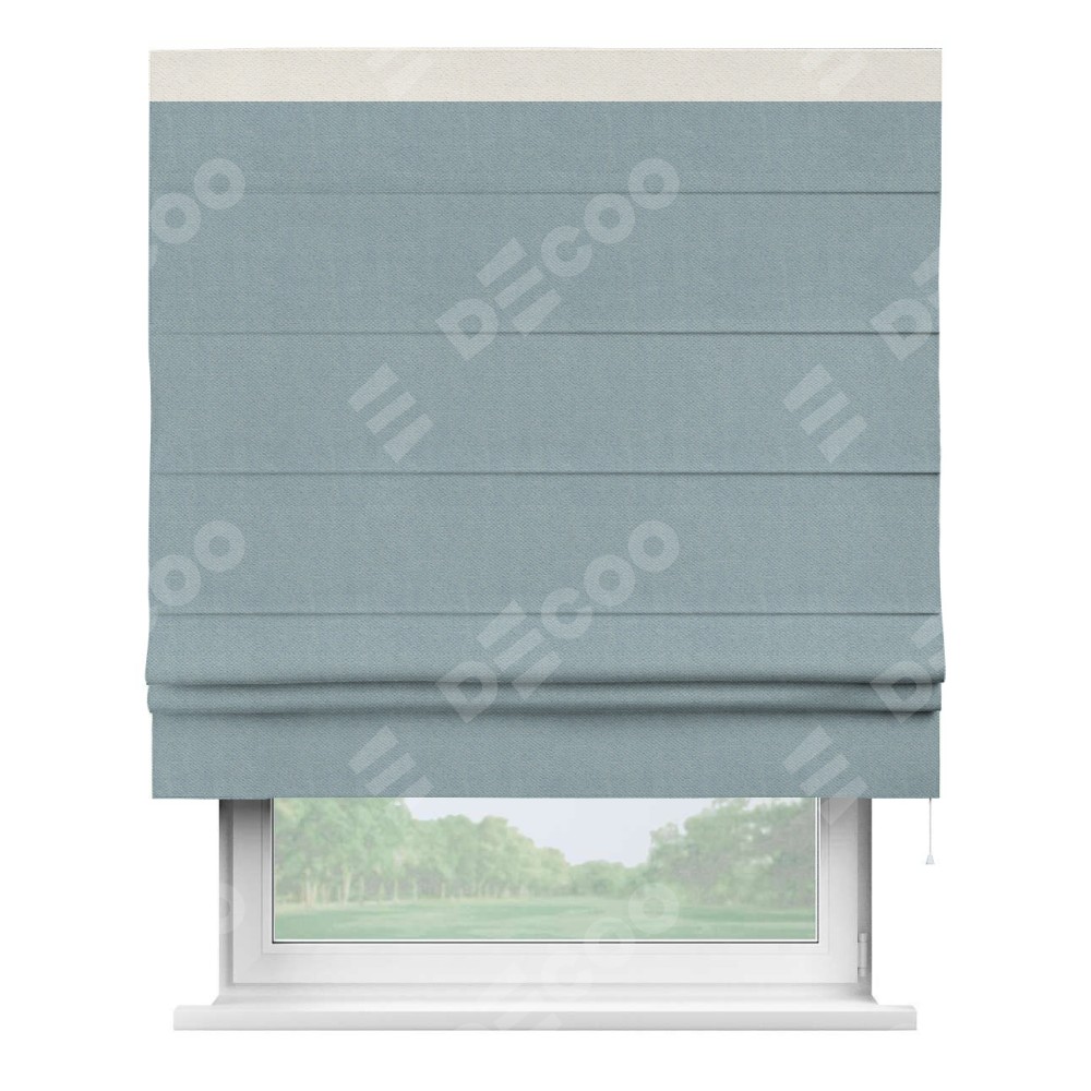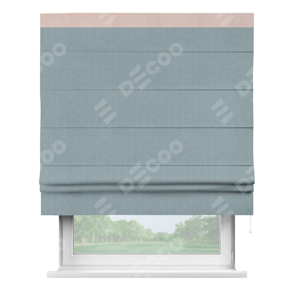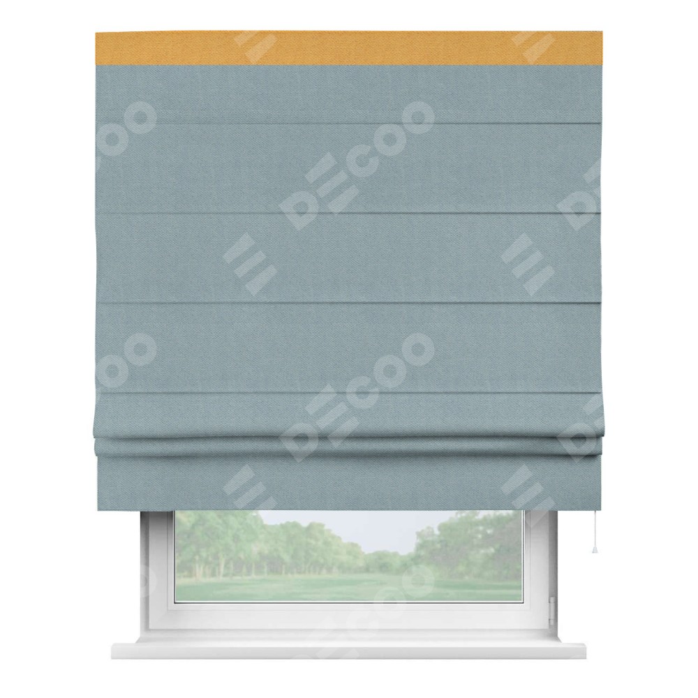 Римская штора производителя «Cortin», используется для проёма, пошита из ткани блэкаут с блеском синий, артикул 34625. Отделка шторы кантом «Кинг», ткань для канта используется из блэкаута с блеском разной расцветки на выбор. Изнаночная сторона материала черного цвета, что обеспечивает необходимую светонепроницаемость. Имеет универсальный механизм и подходит для монтажа: на потолок, на стену и в нишу.
