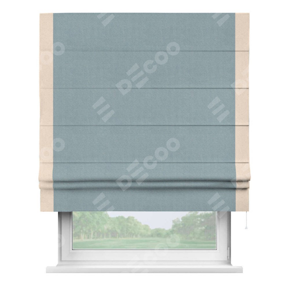 Римская штора производителя «Cortin», используется для проёма, пошита из ткани блэкаут с блеском синий, артикул 34625. Отделка шторы кантом «Стрим Дуо», ткань для канта используется из блэкаута с блеском разной расцветки на выбор. Изнаночная сторона материала черного цвета, что обеспечивает необходимую светонепроницаемость. Имеет универсальный механизм и подходит для монтажа: на потолок, на стену и в нишу.