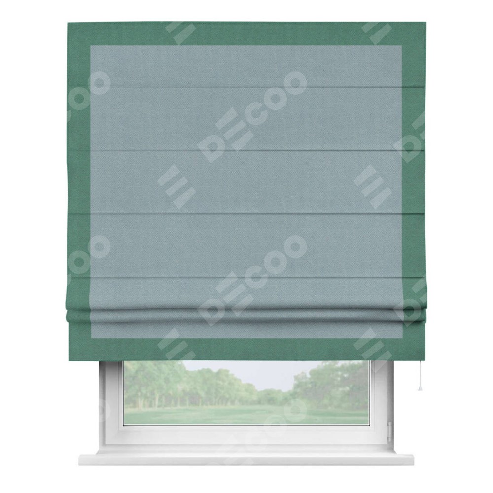 Римская штора производителя «Cortin», используется для проёма, пошита из ткани блэкаут с блеском синий, артикул 34625. Отделка шторы кантом «Чесс», ткань для канта используется из блэкаута с блеском разной расцветки на выбор. Изнаночная сторона материала черного цвета, что обеспечивает необходимую светонепроницаемость. Имеет универсальный механизм и подходит для монтажа: на потолок, на стену и в нишу.