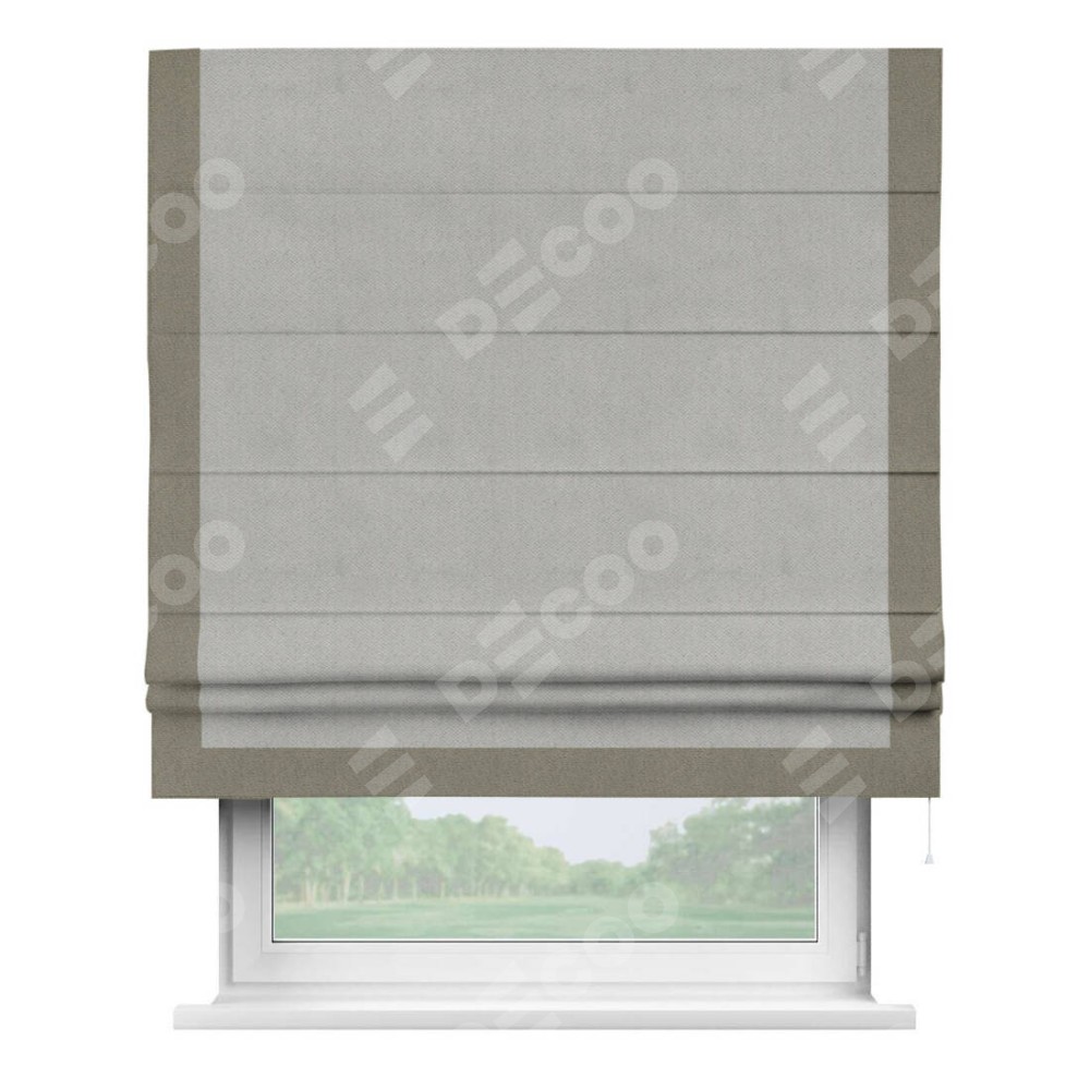 Римская штора производителя «Cortin», используется для проёма, пошита из ткани блэкаут с блеском тёмно-серый, артикул 34634. Отделка шторы кантом «Виктория», ткань для канта используется из блэкаута с блеском разной расцветки на выбор. Изнаночная сторона материала черного цвета, что обеспечивает необходимую светонепроницаемость. Имеет универсальный механизм и подходит для монтажа: на потолок, на стену и в нишу.