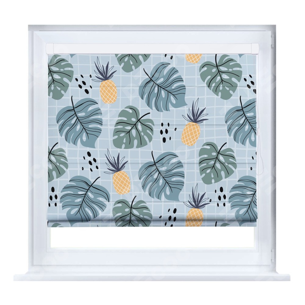 Римская штора производителя «Cortin», устанавливается на створку окна, пошита из ткани блэкаут с нанесением сублимационной печати «Ананасы и листья монстеры». Штора шьётся по индивидуальным размерам, для данного типа римской шторы возможная ширина от 35 до 150 см., высота до 250 см.