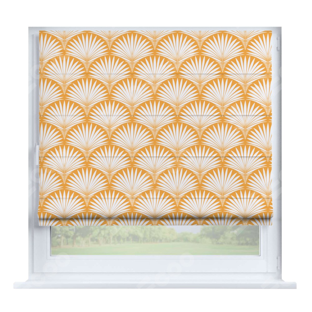 Римская штора производителя «Cortin», устанавливается на створку окна, пошита из ткани блэкаут с нанесением сублимационной печати «Арт-деко листья желтый». Штора шьётся по индивидуальным размерам, для данного типа римской шторы возможная ширина от 35 до 150 см., высота до 250 см.
