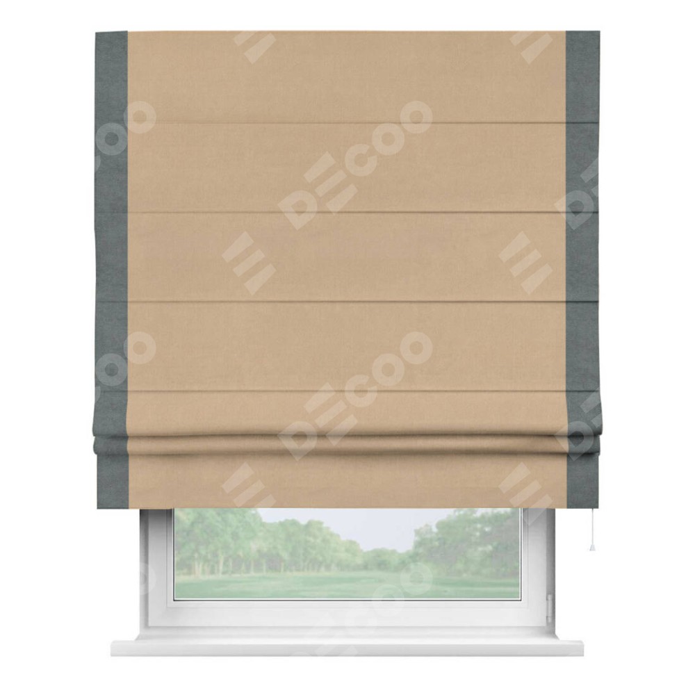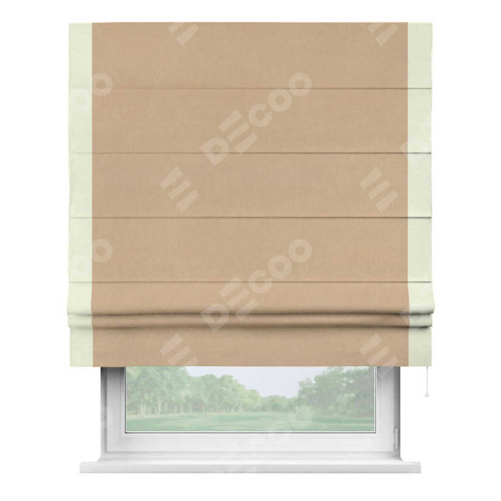 Римская штора производителя «Cortin», используется для проёма, пошита из ткани вельвет песочный, артикул ткани 17740. Отделка шторы кантом «Стрим Дуо», ткань для канта используется из вельвета разной расцветки на выбор. Имеет универсальный механизм и подходит для монтажа: на потолок, на стену и в нишу.