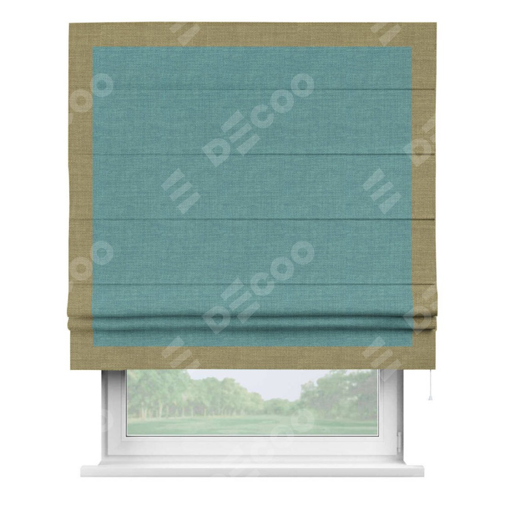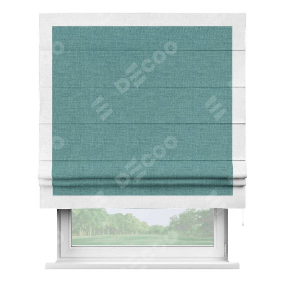 Римская штора производителя «Cortin», используется для проёма, пошита из ткани лён бирюза, артикул 7446. Отделка шторы кантом «Чесс», ткань для канта используется из льна разной расцветки на выбор. Имеет универсальный механизм и подходит для монтажа: на потолок, на стену и в нишу.