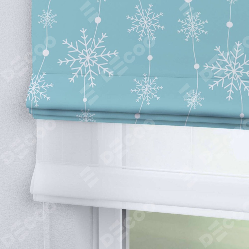 Римская штора день-ночь производителя «Cortin», используется для проёма, пошита из двух полотен, с лицевой блэкаут с нанесением сублимационной печати «Гирлянда из снежинок», вторая ткань тюль (по стандарту комплектуется тюль белого цвета артикул V-01). Имеет универсальный механизм и подходит для монтажа: на потолок, на стену и в нишу.