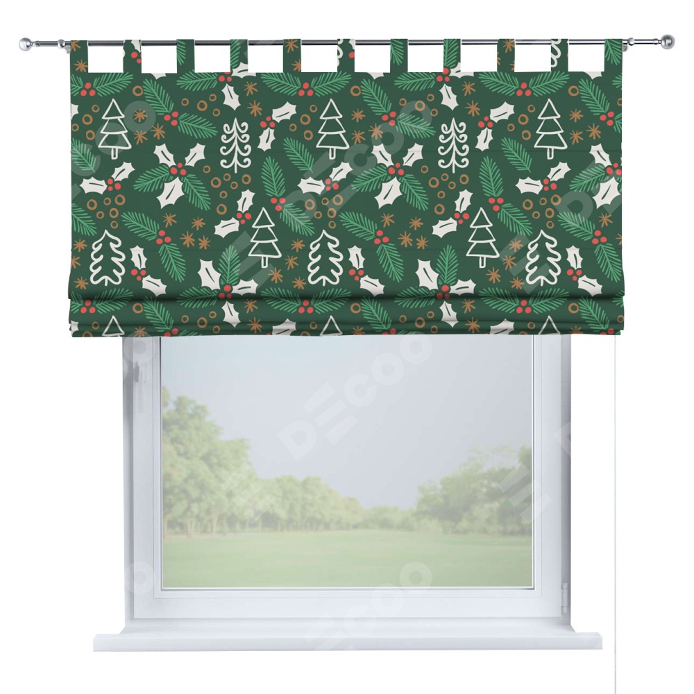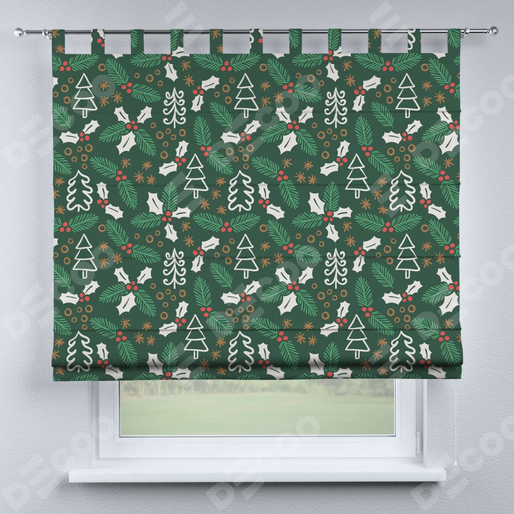 Римская штора производителя «Cortin», используется для проёма, пошита из ткани блэкаут с нанесением сублимационной печати «Рождественский узор». Данная модель пошита на петлях, комплектуется на выбор круглым карнизом и подходит для монтажа на стену. Римская штора на петлях имеет простую систему регулировки высоты, отличительным преимуществом данной модели является простой способ монтажа. Достаточно повесить ее на трубу и штора готова!