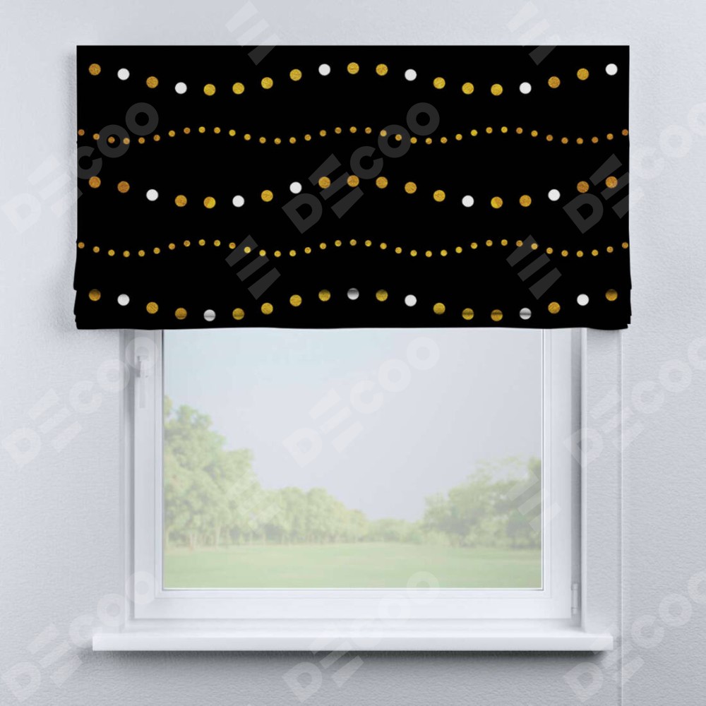 Римская штора производителя «Cortin», используется для проёма, пошита из ткани блэкаут с нанесением сублимационной печати «Яркие огоньки». Имеет универсальный механизм и подходит для монтажа: на потолок, на стену и в нишу.