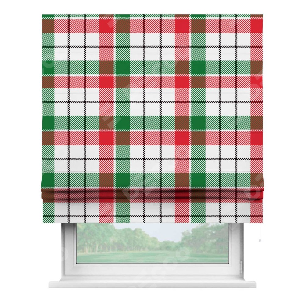 Римская штора производителя «Cortin», используется для проёма, пошита из ткани блэкаут с нанесением сублимационной печати «Трёхцветная клетка». Имеет универсальный механизм и подходит для монтажа: на потолок, на стену и в нишу.