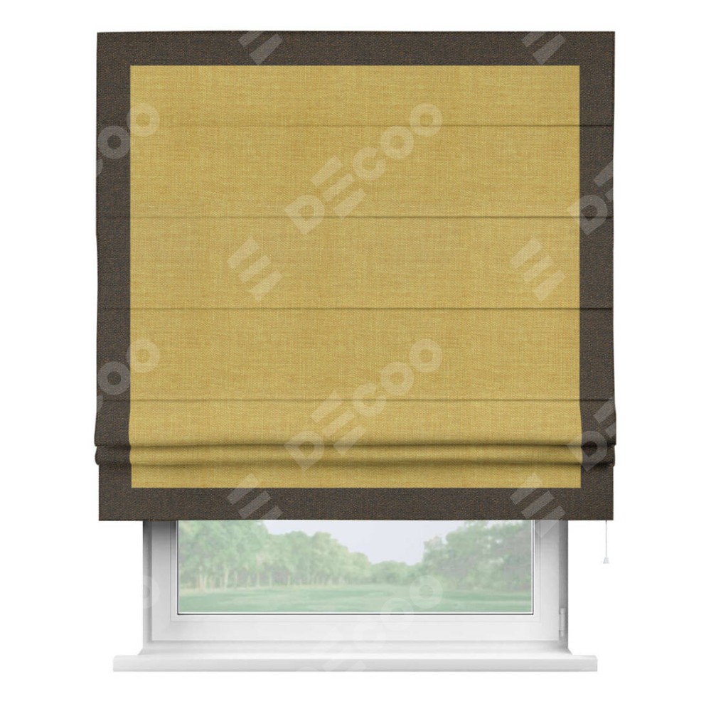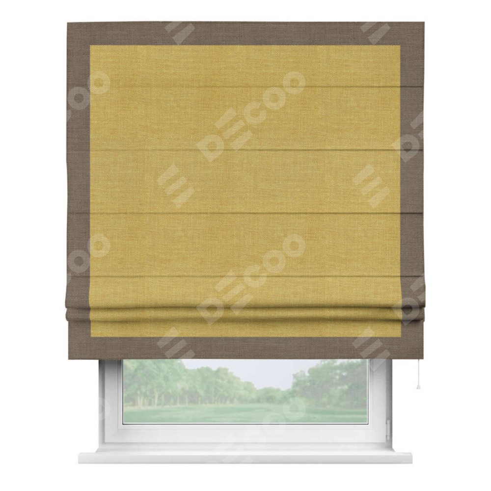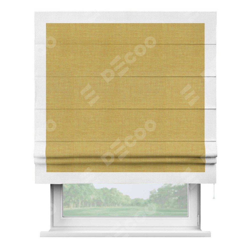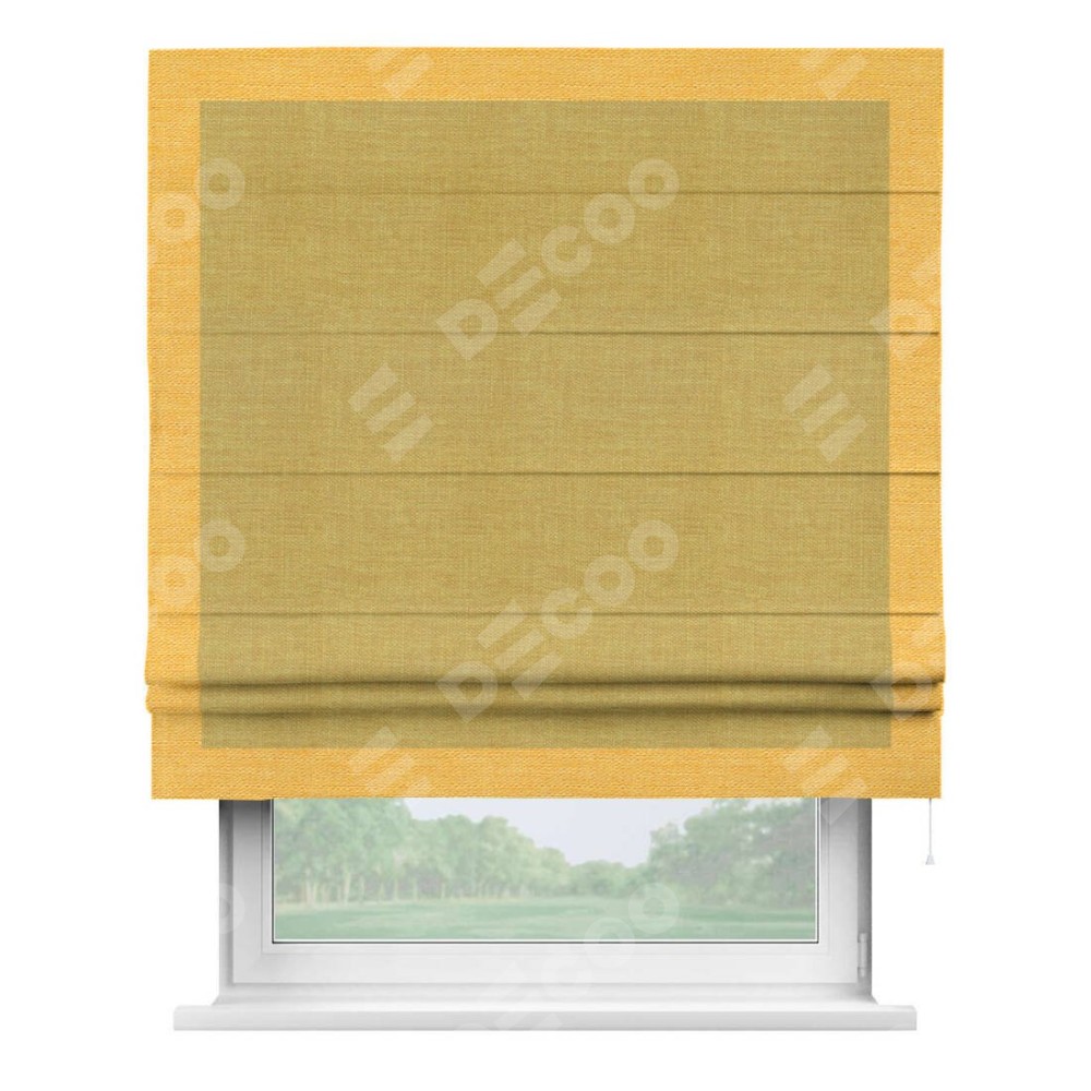 Римская штора производителя «Cortin», используется для проёма, пошита из ткани лён горчичный, артикул 74740. Отделка шторы кантом «Чесс», ткань для канта используется из льна разной расцветки на выбор. Имеет универсальный механизм и подходит для монтажа: на потолок, на стену и в нишу.