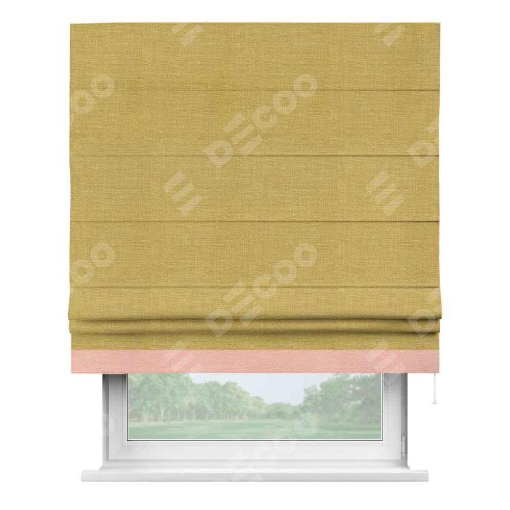 Римская штора производителя «Cortin», используется для проёма, пошита из ткани лён горчичный, артикул 74740. Отделка шторы кантом «Джестер», ткань для канта используется из льна разной расцветки на выбор. Имеет универсальный механизм и подходит для монтажа: на потолок, на стену и в нишу.