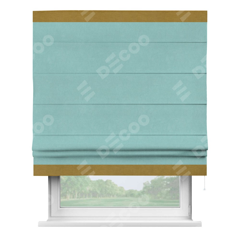 Римская штора производителя «Cortin», используется для проёма, пошита из ткани вельвет тиффани, артикул ткани 17765. Отделка шторы кантом «Горизонт», ткань для канта используется из вельвета разной расцветки на выбор. Имеет универсальный механизм и подходит для монтажа: на потолок, на стену и в нишу.