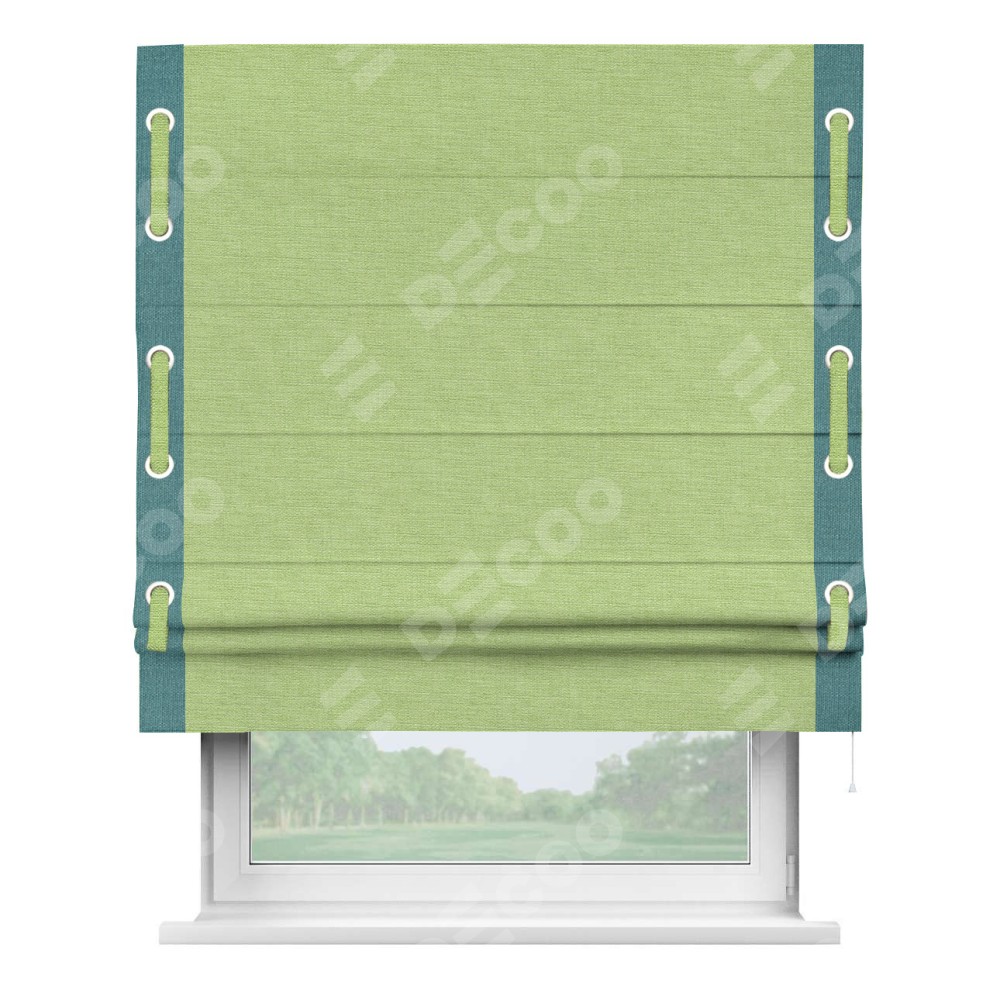 Римская штора производителя «Cortin», используется для проёма, пошита из ткани лён зеленый, артикул 85906. Отделка шторы кантом «Стрим Дуо» на кантах расположены люверсы с пояском, ткань для канта используется из льна разной расцветки на выбор. Ткань для пояска обычно используется из основной ткани шторы, а так же можно сделать из любой расцветки по желанию. Имеет универсальный механизм и подходит для монтажа: на потолок, на стену и в нишу.