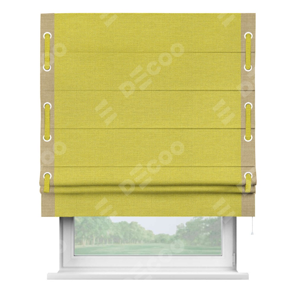 Римская штора производителя «Cortin», используется для проёма, пошита из ткани лён салатовый, артикул 53437. Отделка шторы кантом «Стрим Дуо» на кантах расположены люверсы с пояском, ткань для канта используется из льна разной расцветки на выбор. Ткань для пояска обычно используется из основной ткани шторы, а так же можно сделать из любой расцветки по желанию. Имеет универсальный механизм и подходит для монтажа: на потолок, на стену и в нишу.