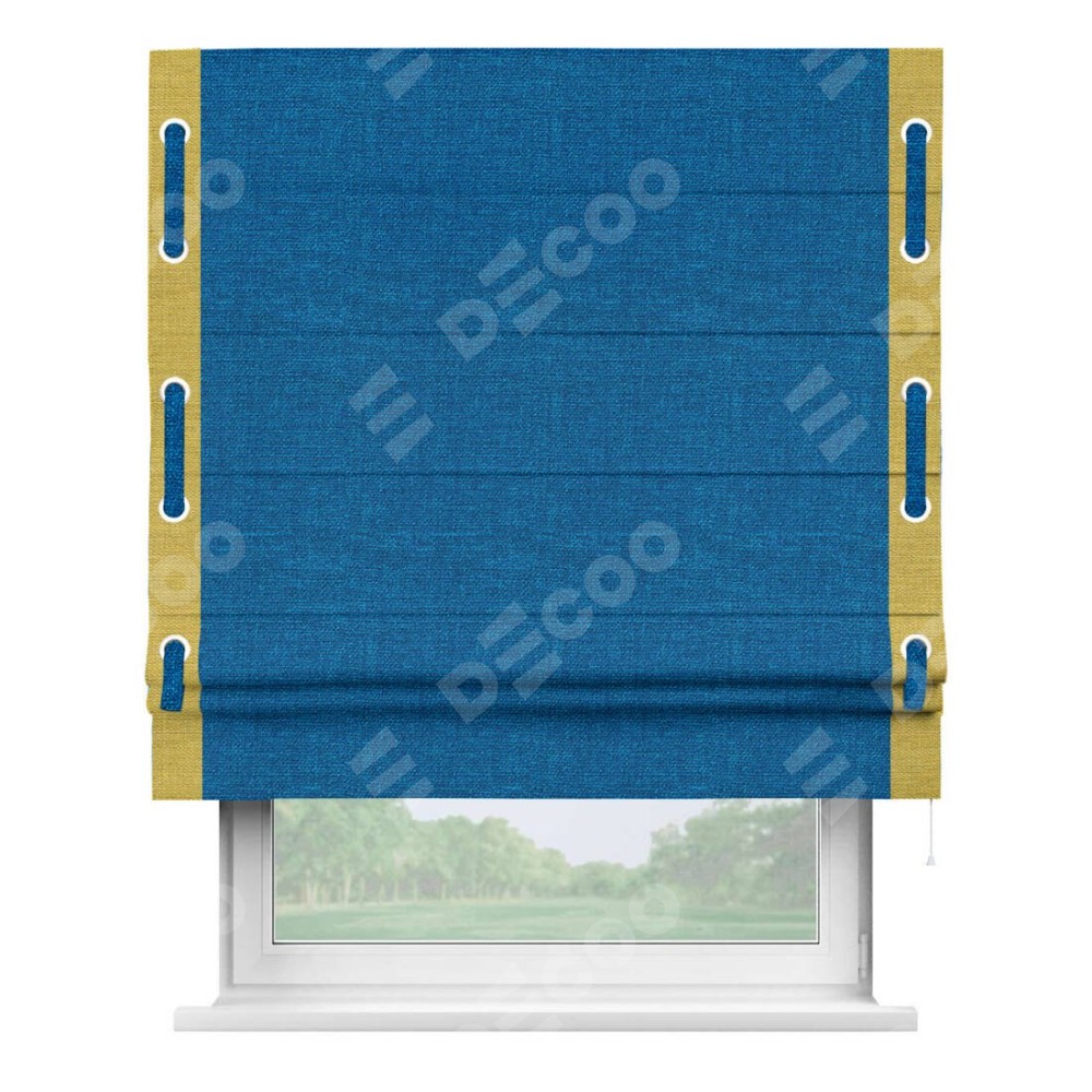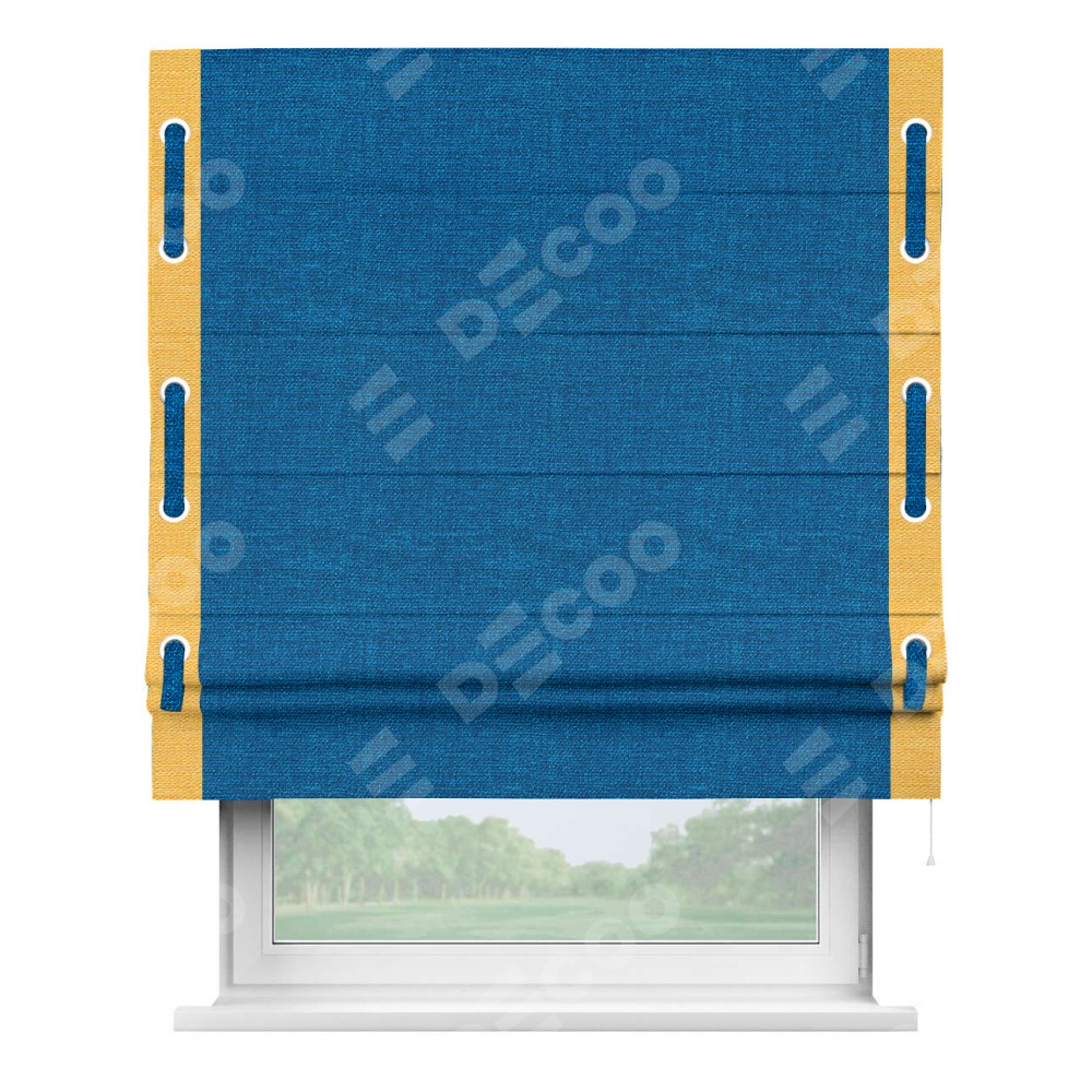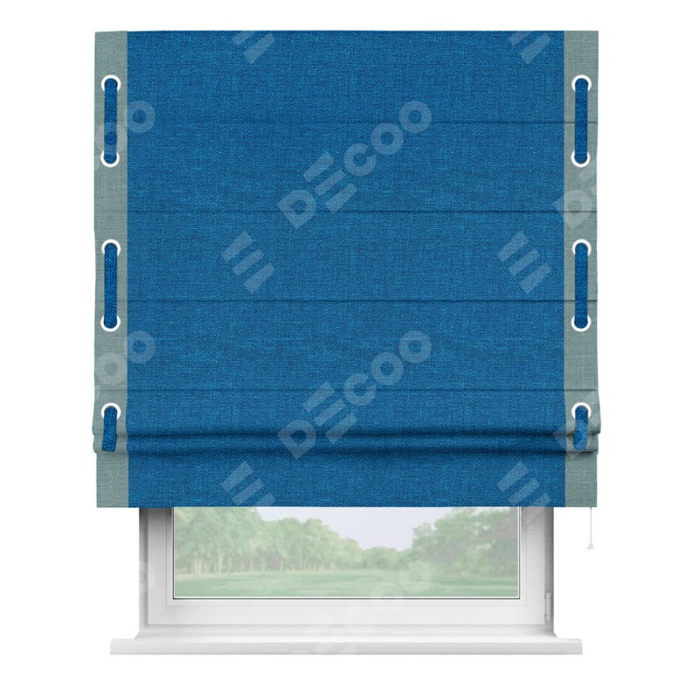 Римская штора производителя «Cortin», используется для проёма, пошита из ткани лён синий, артикул 63742. Отделка шторы кантом «Стрим Дуо» на кантах расположены люверсы с пояском, ткань для канта используется из льна разной расцветки на выбор. Ткань для пояска обычно используется из основной ткани шторы, а так же можно сделать из любой расцветки по желанию. Имеет универсальный механизм и подходит для монтажа: на потолок, на стену и в нишу.