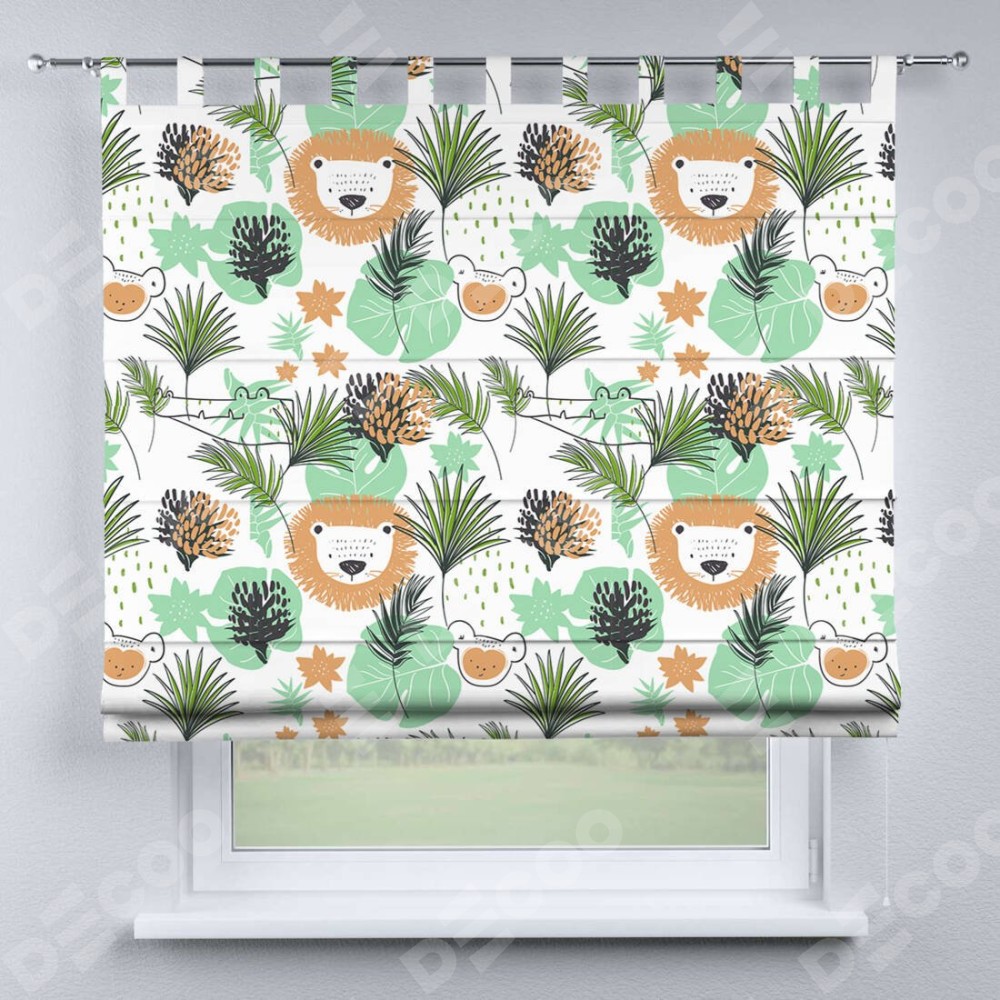Римская штора производителя «Cortin», используется для проёма, пошита из ткани блэкаут с нанесением сублимационной печати «Животные из джунглей». Данная модель пошита на петлях, комплектуется на выбор круглым карнизом и подходит для монтажа на стену. Римская штора на петлях имеет простую систему регулировки высоты, отличительным преимуществом данной модели является простой способ монтажа. Достаточно повесить ее на трубу и штора готова!