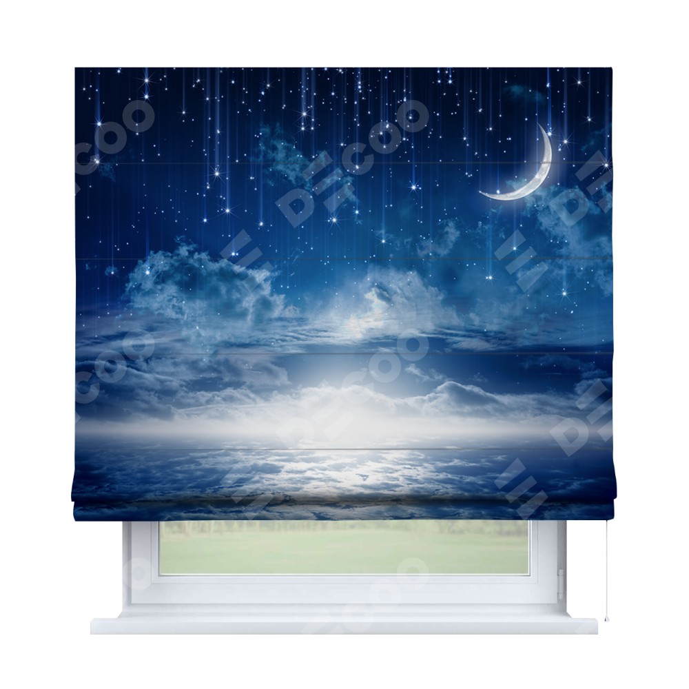Римская штора производителя «Cortin», используется для проёма, пошита из ткани блэкаут с нанесением сублимационной печати «Ночное небо». Имеет универсальный механизм и подходит для монтажа: на потолок, на стену и в нишу.