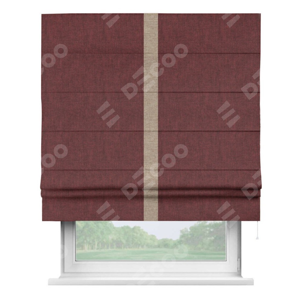 Римская штора производителя «Cortin», используется для проёма, пошита из ткани лён кашемир бордовый, артикул 17213. Отделка шторы кантом «Хайвэй», ткань для канта используется из льна разной расцветки на выбор. Имеет универсальный механизм и подходит для монтажа: на потолок, на стену и в нишу.