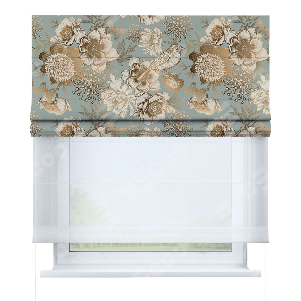 Римская штора день-ночь производителя «Cortin», используется для проёма, пошита из двух полотен, с лицевой блэкаут с нанесением сублимационной печати «Садовые цветы», вторая ткань тюль (по стандарту комплектуется тюль белого цвета артикул V-01). Имеет универсальный механизм и подходит для монтажа: на потолок, на стену и в нишу.