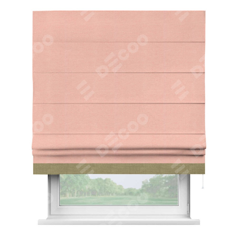 Римская штора производителя «Cortin», используется для проёма, пошита из ткани лён розовый, артикул 00005. Отделка шторы кантом «Джестер», ткань для канта используется из льна разной расцветки на выбор. Имеет универсальный механизм и подходит для монтажа: на потолок, на стену и в нишу.