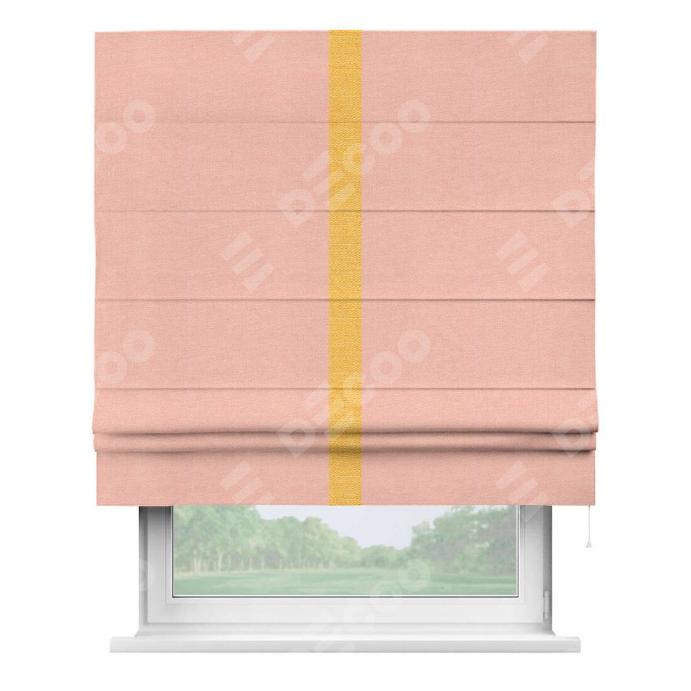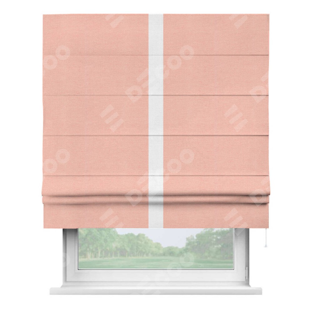 Римская штора производителя «Cortin», используется для проёма, пошита из ткани лён розовый, артикул 00005. Отделка шторы кантом «Хайвэй», ткань для канта используется из льна разной расцветки на выбор. Имеет универсальный механизм и подходит для монтажа: на потолок, на стену и в нишу.