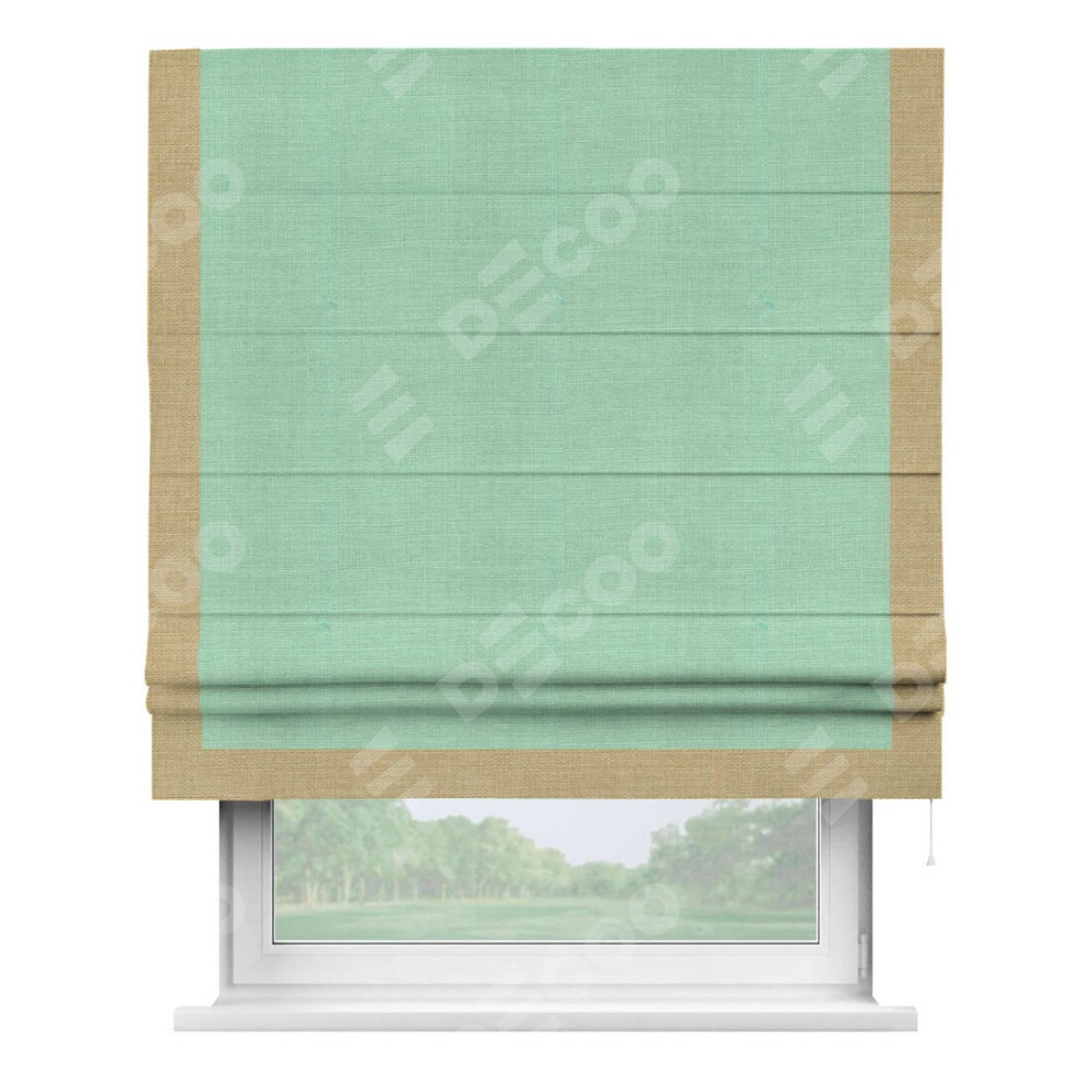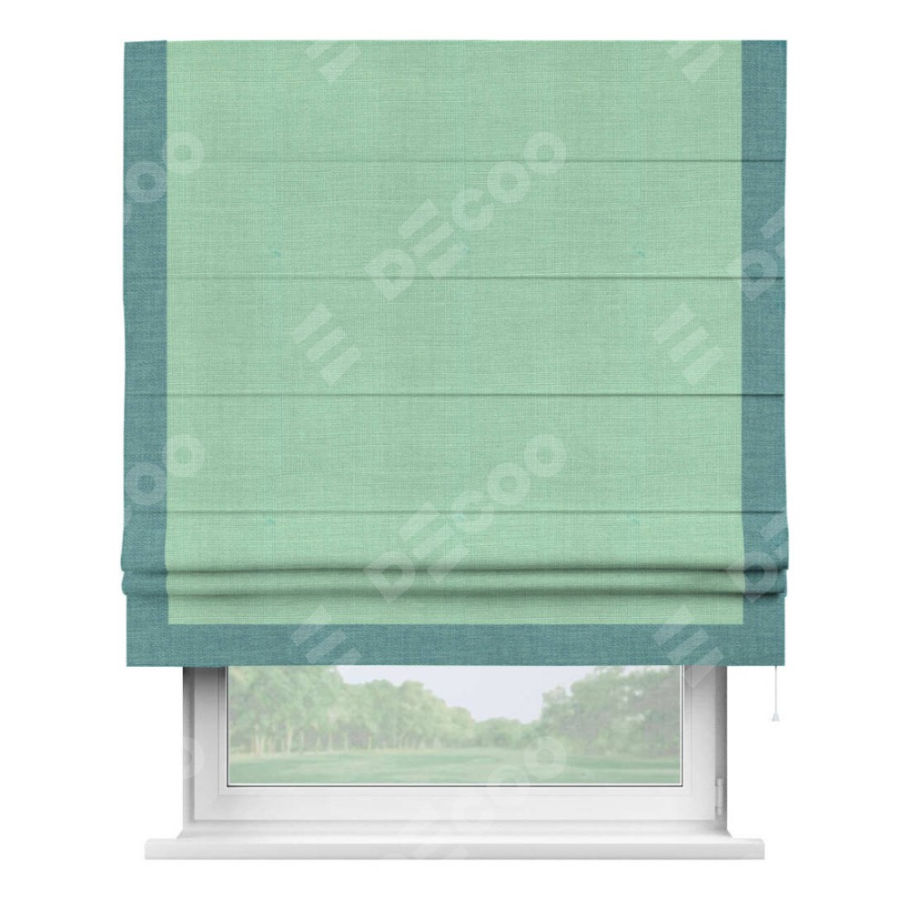 Римская штора производителя «Cortin», используется для проёма, пошита из ткани лён светло-бирюзовый, артикул 74737. Отделка шторы кантом «Виктория», ткань для канта используется из льна разной расцветки на выбор. Имеет универсальный механизм и подходит для монтажа: на потолок, на стену и в нишу.