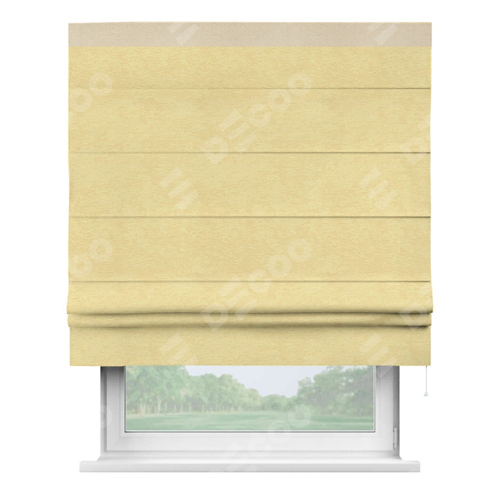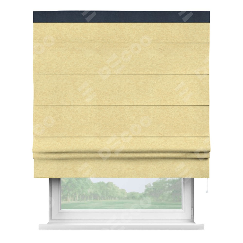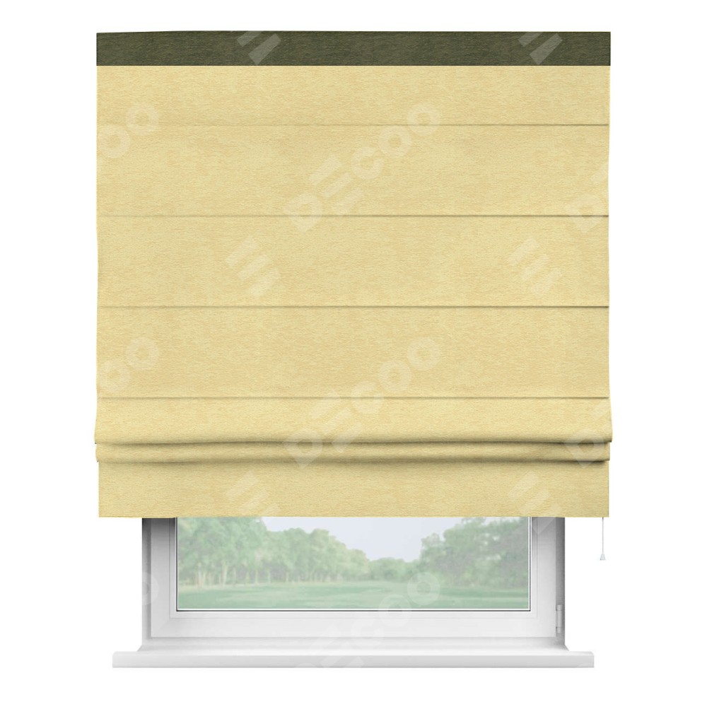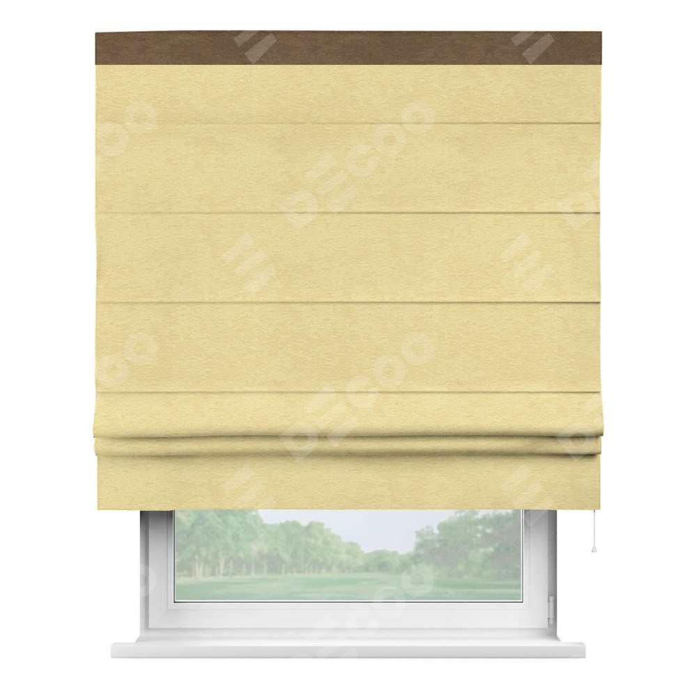 Римская штора производителя «Cortin», используется для проёма, пошита из ткани софт однотонный золотой, артикул 42934. Отделка шторы кантом «Кинг», ткань для канта используется из софта разной расцветки на выбор. Имеет универсальный механизм и подходит для монтажа: на потолок, на стену и в нишу.